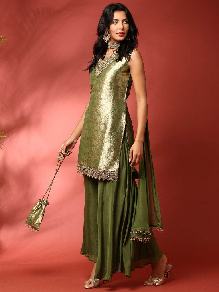 Green banarasi silk embroidered short kurta and palazoo Three piece set