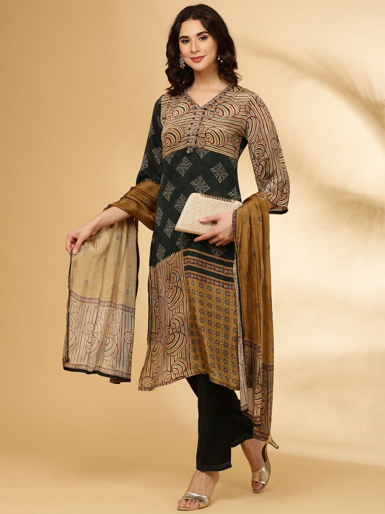 This green rayon printed three-piece set combines comfort and style effortlessly. Crafted from soft rayon fabric, it ensures breathable wear throughout the day. The vibrant printed design adds a fresh, elegant touch, perfect for casual outings or relaxed gatherings. Each piece complements the others for a coordinated look that’s easy to wear and maintain. Ideal for those seeking a versatile and comfortable outfit with subtle charm.