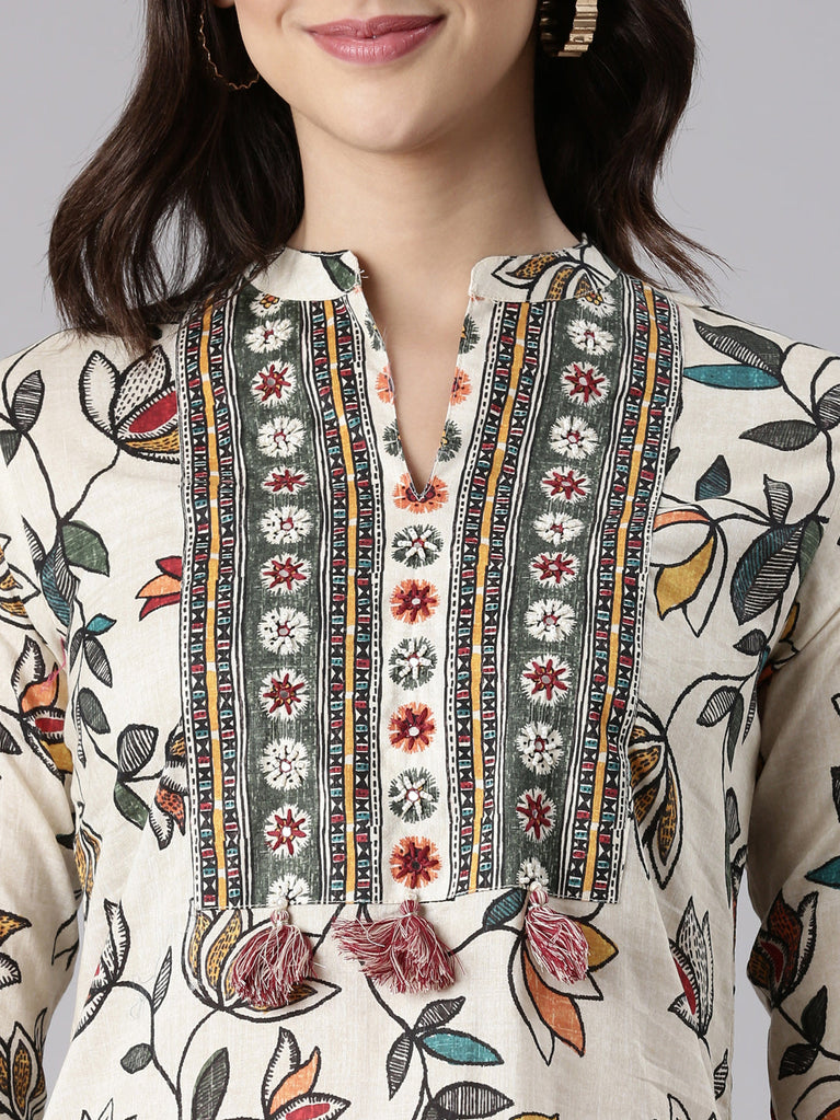 L Beige Slub Rayon Printed Three Piece Set