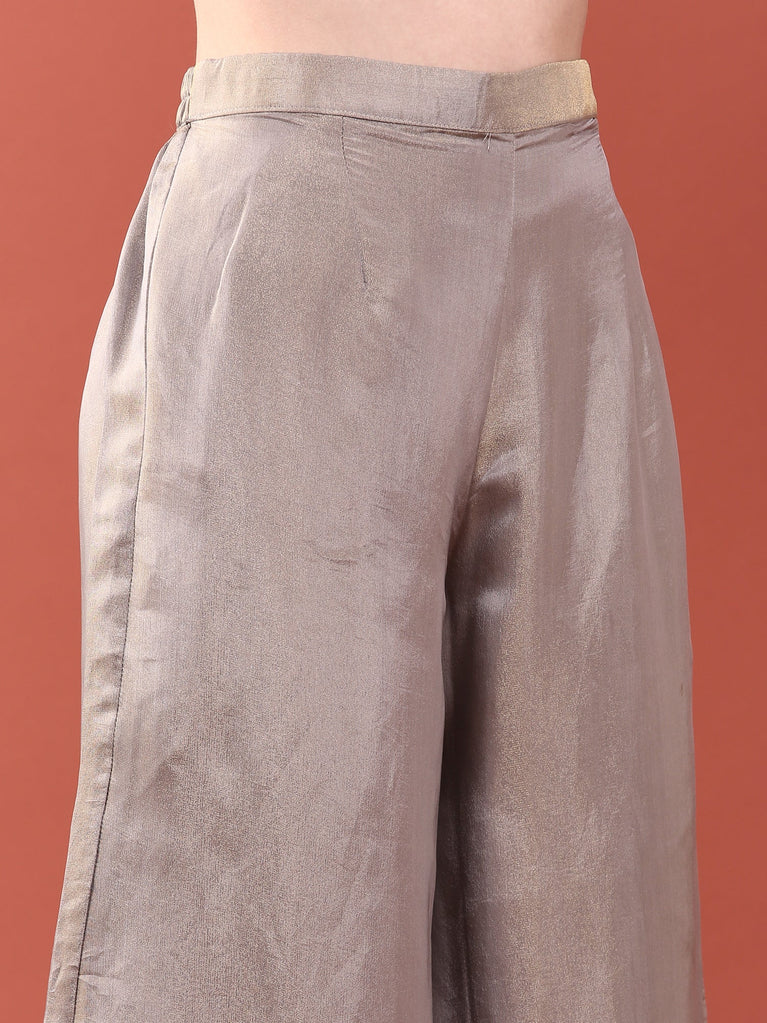 Elevate your style with the Ice Blue Banaras Silk Embroidery Peplum Palazzo. Crafted from rich Banaras silk, this elegant set features intricate embroidery that adds a touch of traditional charm. The peplum top offers a flattering silhouette, while the palazzo pants provide comfort and grace. Perfect for festive occasions or special gatherings, this ensemble blends classic beauty with modern comfort effortlessly.