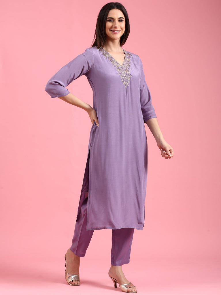 Lavender Viscose Embroidery Three Piece Suit Set