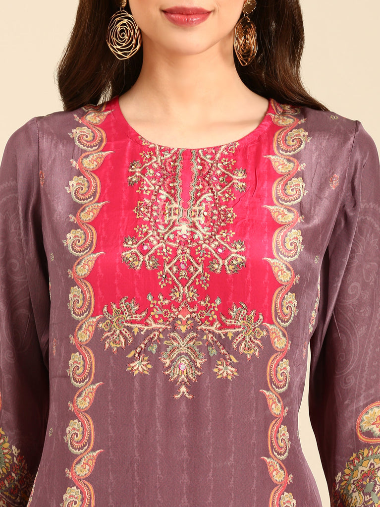 Elevate your wardrobe with this light purple three-piece crepe silk suit set featuring a sophisticated digital print. Crafted from smooth crepe silk, it combines delicate moti embroidery and mirror work for subtle shine and texture. Perfectly balanced between traditional craftsmanship and modern aesthetics, this set offers both comfort and elegance for special occasions.