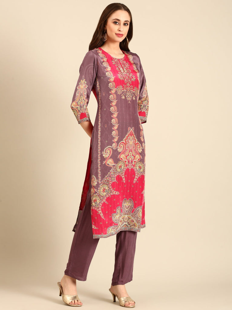 Elevate your ethnic wardrobe with this exquisite three-piece ensemble crafted from premium modal silk. The lavender base provides a sophisticated canvas for intricate floral digital prints that showcase contemporary design sensibilities. This versatile set combines comfort with elegance, making it ideal for festive occasions, celebrations, or refined everyday wear.