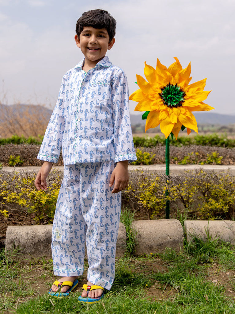Seahorse Block Printed Cotton Top & Pyjama Set