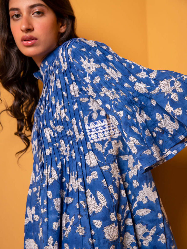 Blue Paradise Block Printed Cotton Pintuck Dress