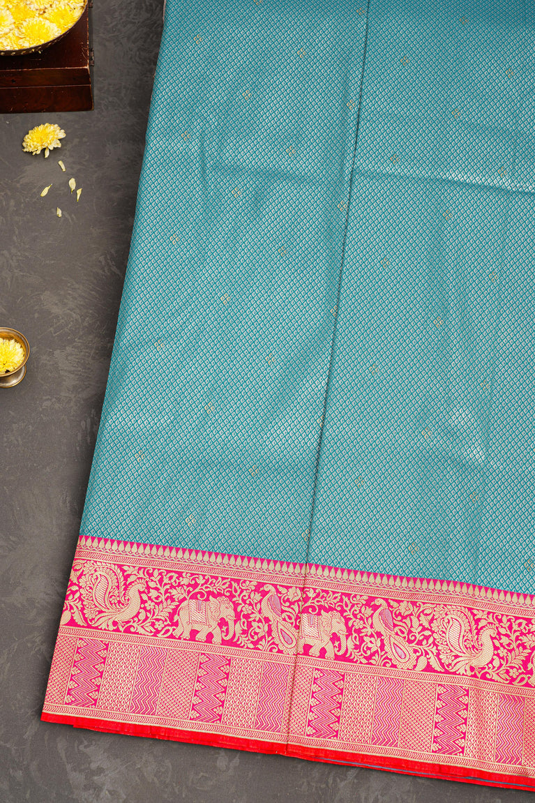 Exude royalty in this rich Dark Magenta Purple Kanjivaram Silk Saree ornamented with intricate gold zari woven floral jaal design. The contrasting aqua blue border with floral and kaddi pattern elevates the elegance. Perfect for festive celebrations.