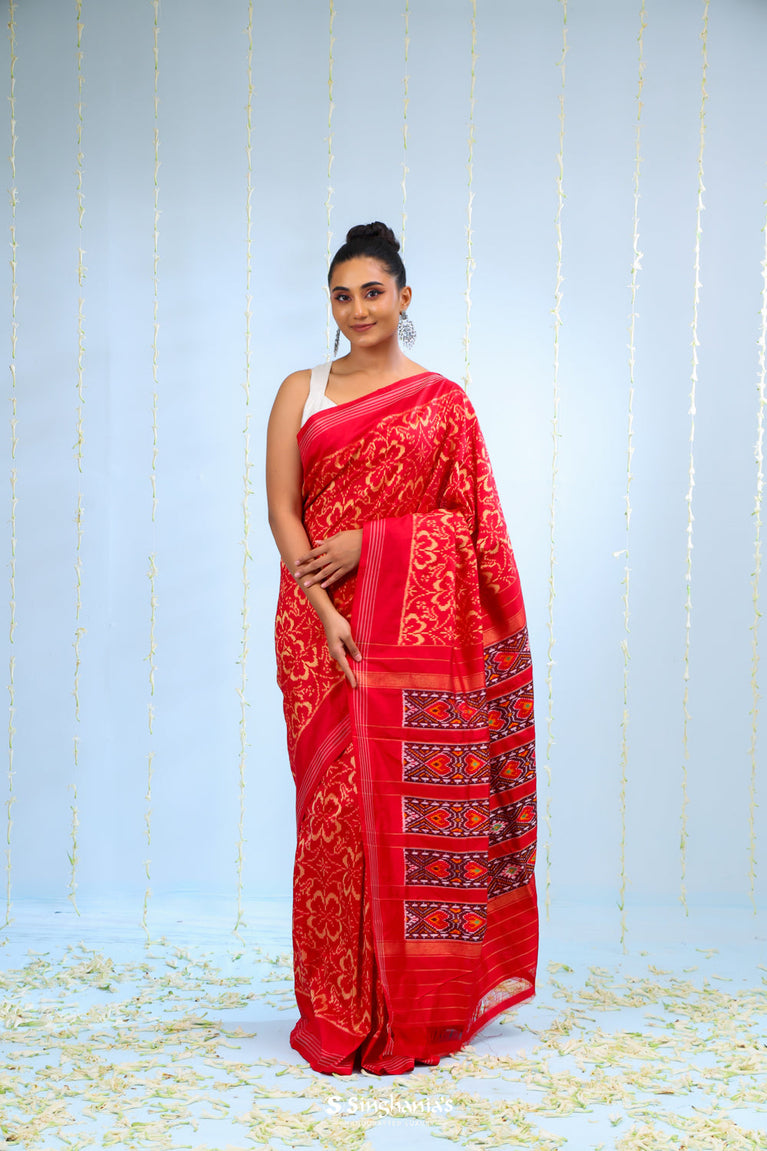 Deep Red Ikkat Patola Silk Saree With Jaal Design