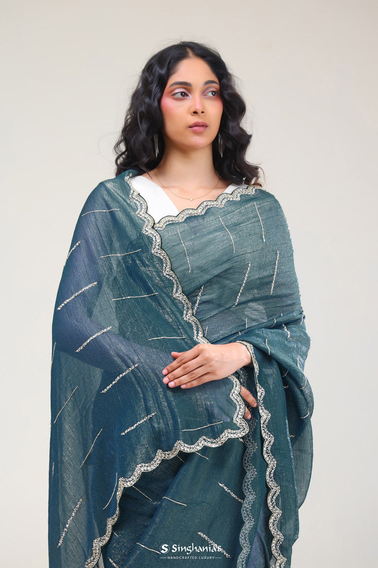 A saree that glows as beautifully as you do! This dark teal saree is woven with tissue fabric, creating a rich, radiant shimmer. Accentuated with glass beads and stones embroidery, it’s an excellent choice for festivals, receptions and grand celebrations.