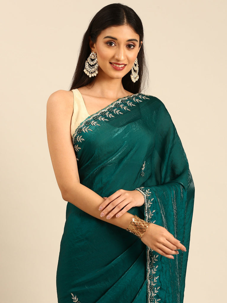 Green Jimmy crushed tissue saree with pearls & sequins embroidery with heavy ready made blouse