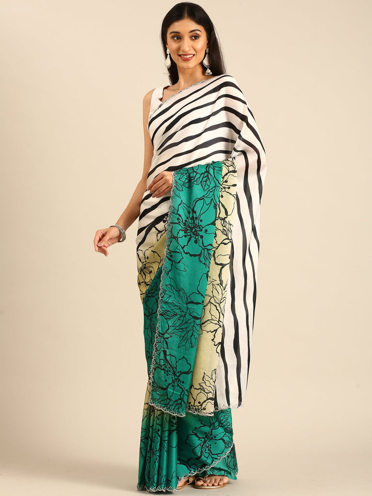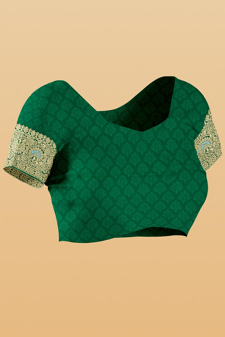 This elegant green satin saree features intricate printed patterns enhanced with sparkling Swarovski embroidery. The smooth satin fabric drapes gracefully, offering a luxurious feel and a stunning silhouette. Ideal for festive occasions or formal events, this saree combines traditional artistry with modern embellishments, ensuring you stand out with refined sophistication.