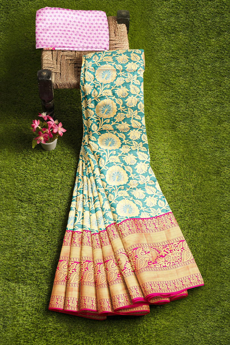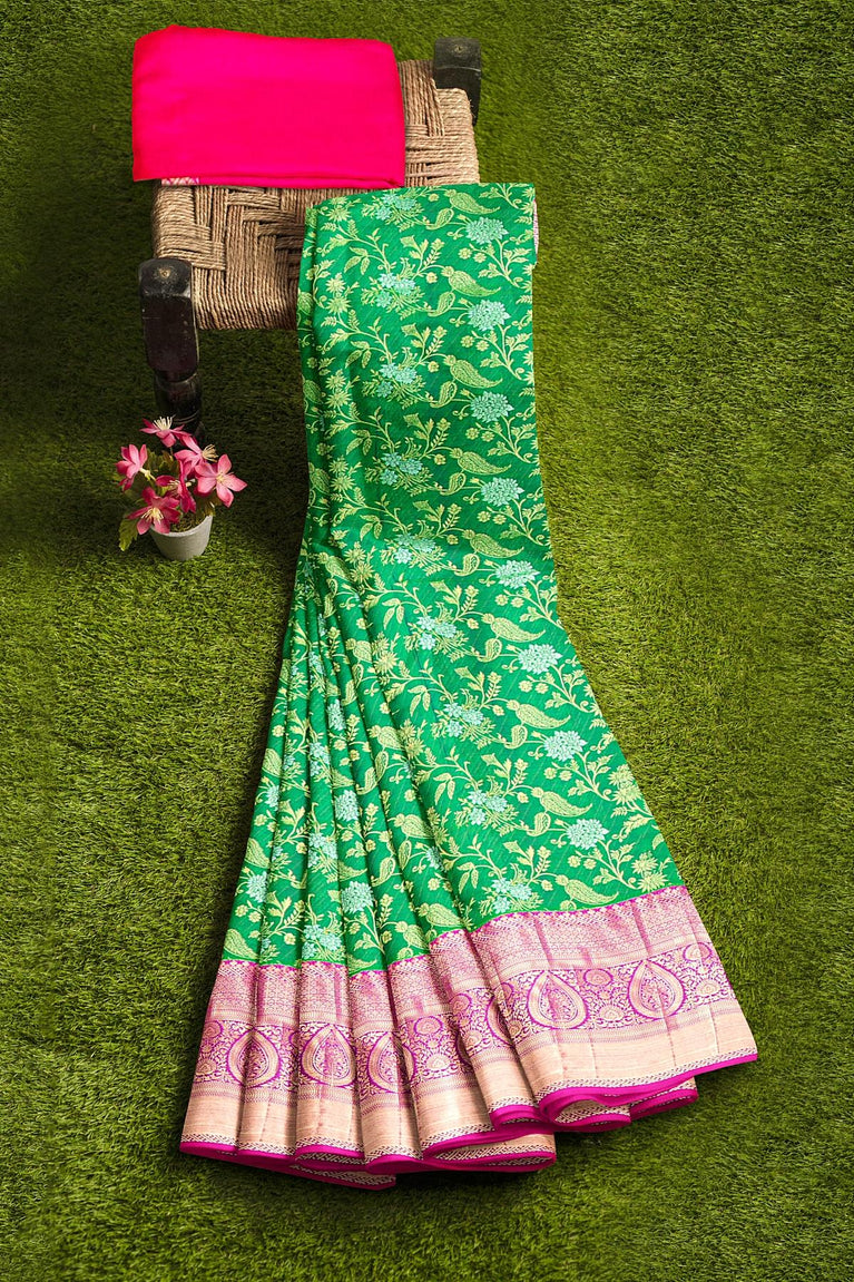 GREEN and PINK FLORAL JAAL SILK BLEND Saree with SEMI PATTU