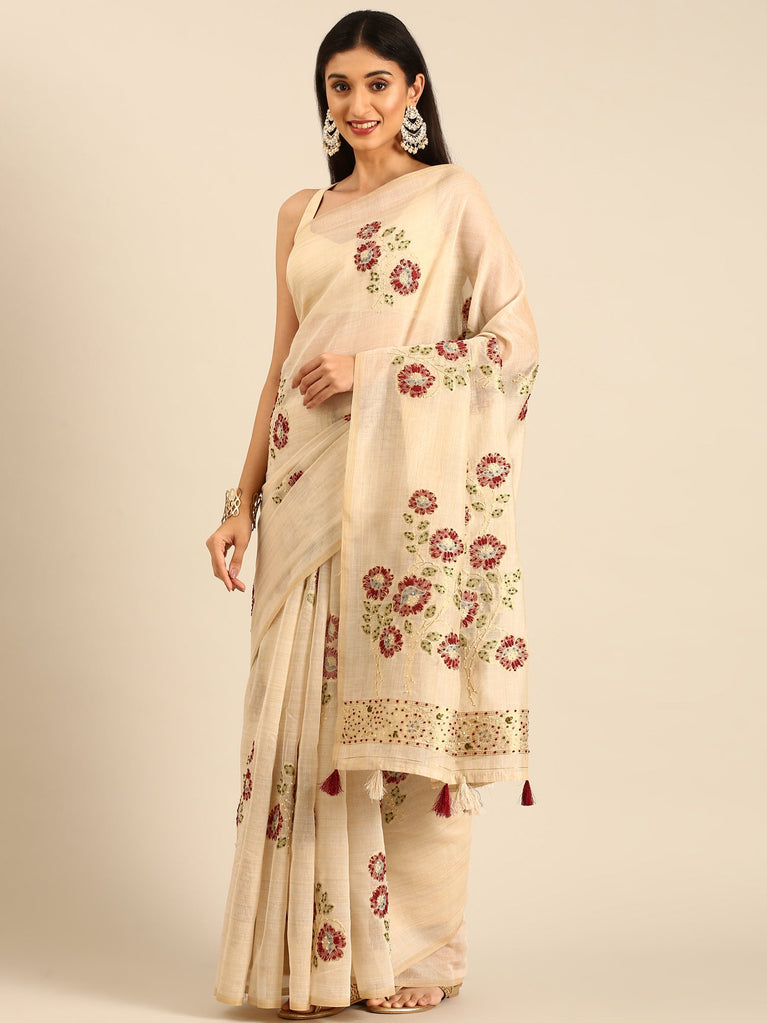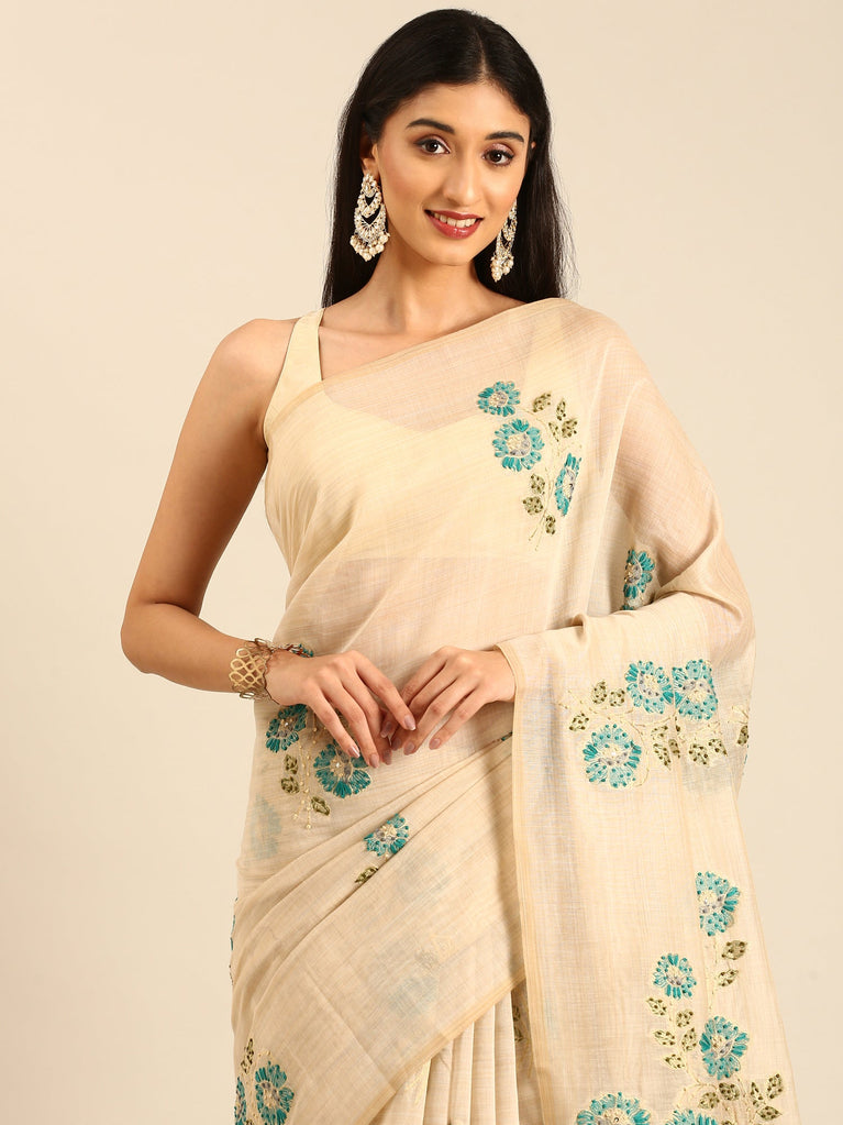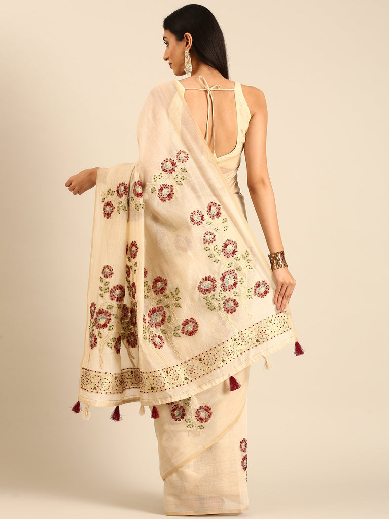 Cream Chanderi Silk Saree With Sequins And French Knot Embroidery