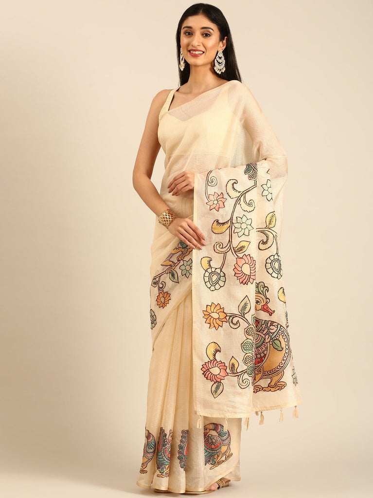 Cream kota saree with kalamkari appliqué work on Pallu