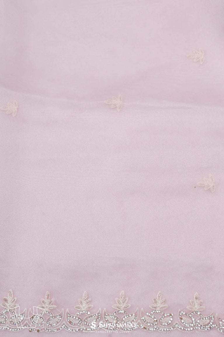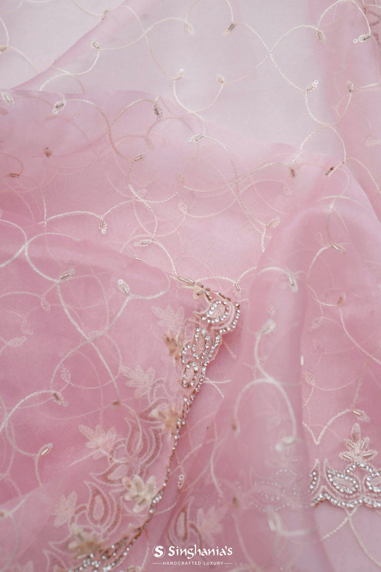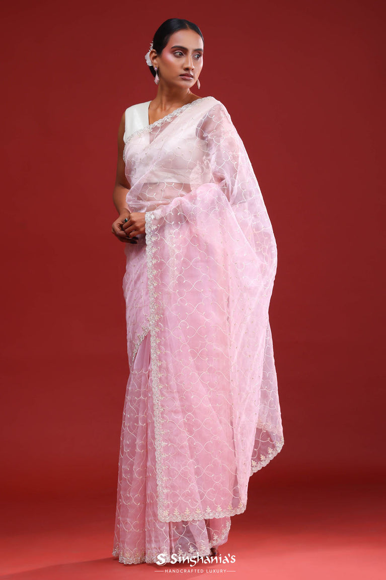 This beautiful cotton pink organza saree is ideal for party and festive celebrations. The delicate floral jaali work on the body, enhanced by a minimal floral work in sequins and glass beads, creates a luxurious and refreshing look. Includes a matching blouse piece.