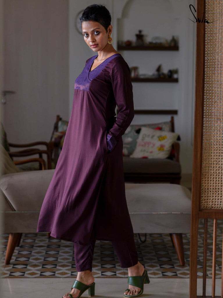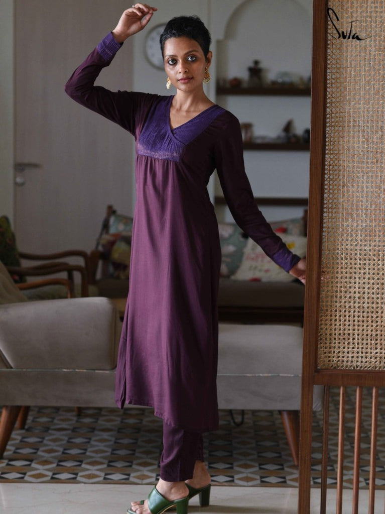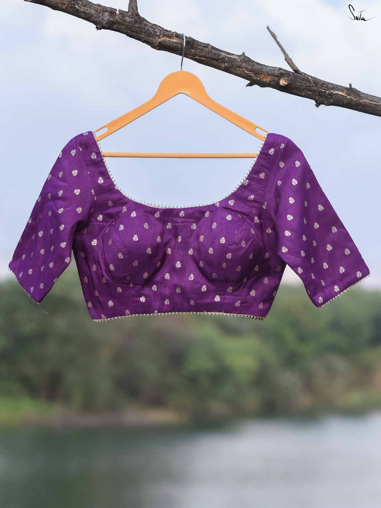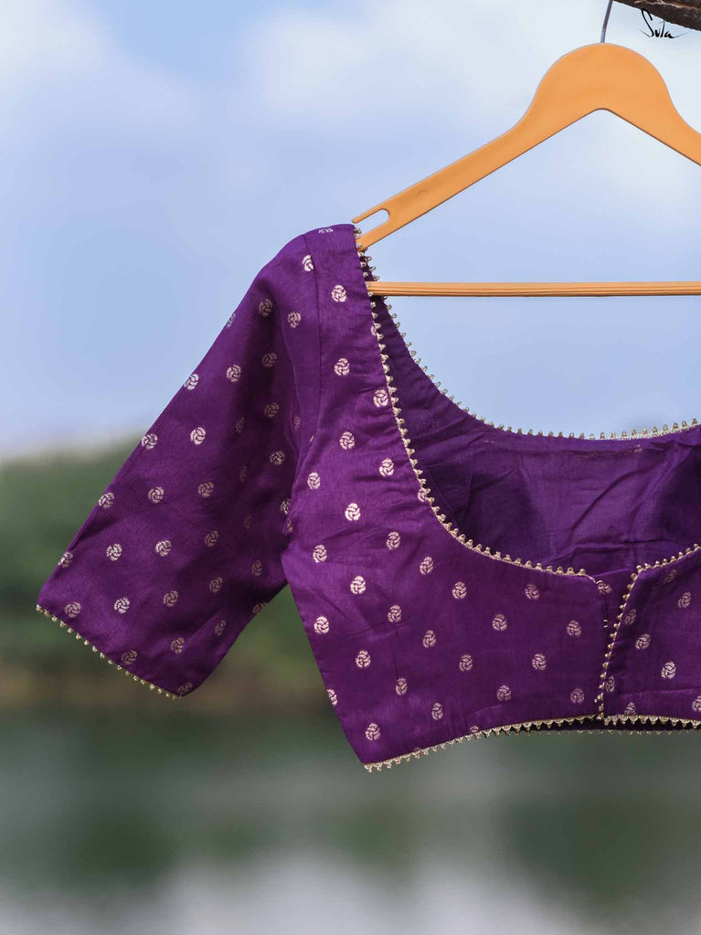This vibrant purple brocade blouse, Chiuli Vasant, is made from a lightweight viscose blend. With its round neckline and elbow-length sleeves, it adds a lively energy to any outfit.