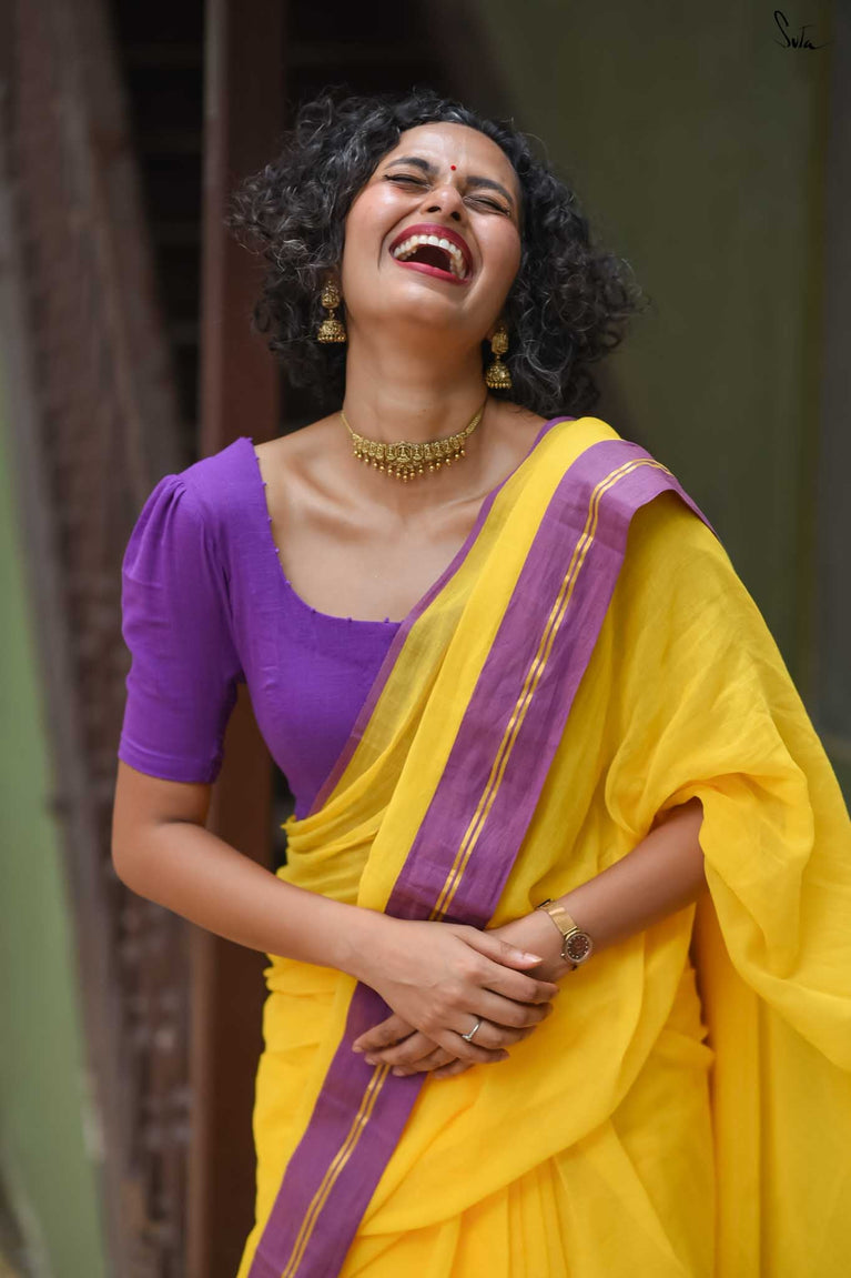 The model is wearing size S blouse and the saree is Dipped in Sunflower