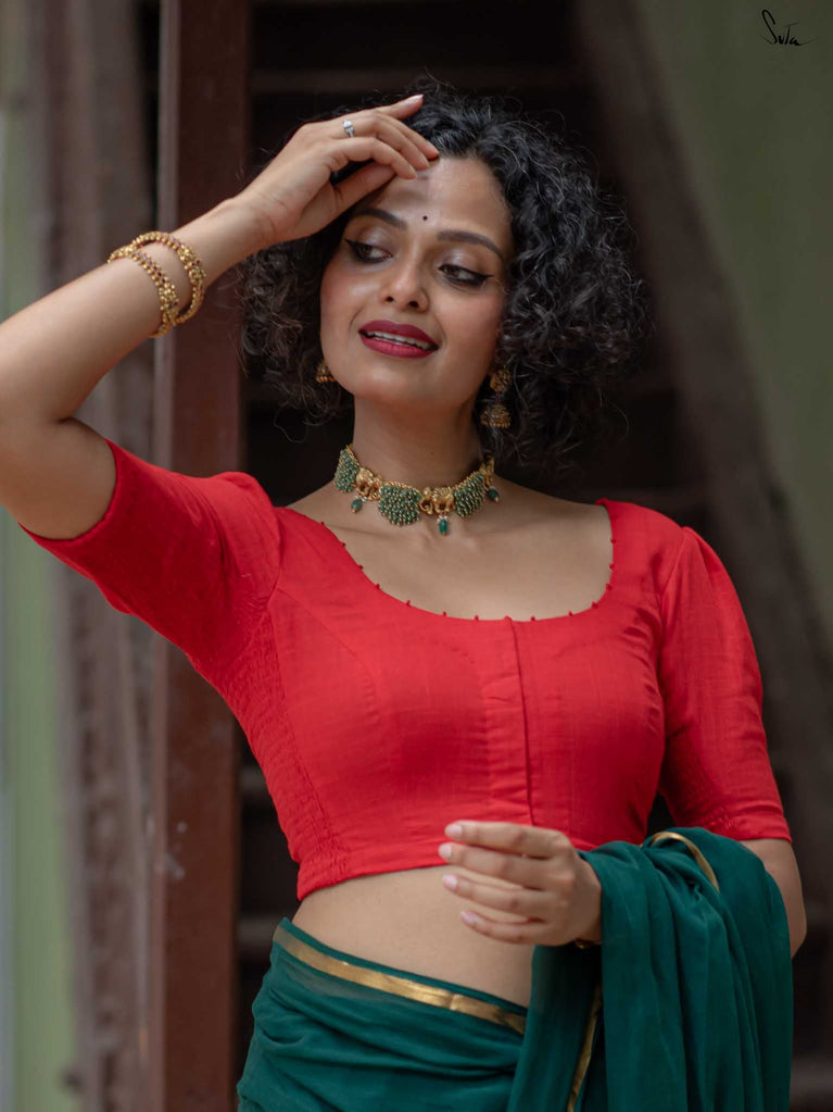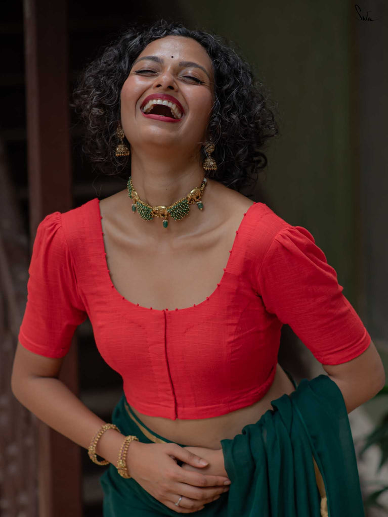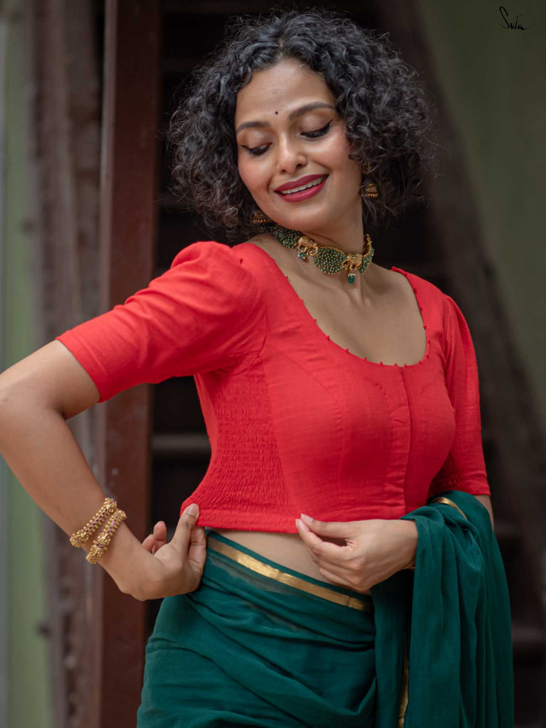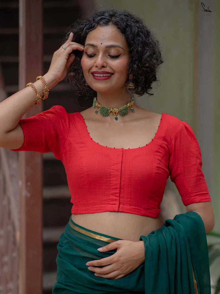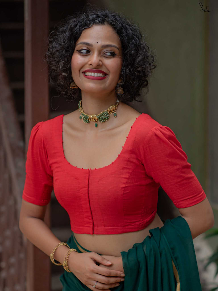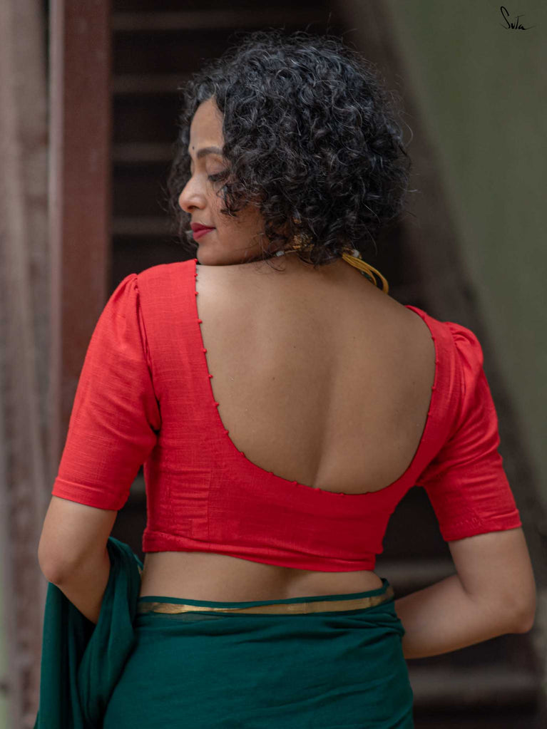 Dipped in Alta brings bold red energy in a no-fuss, everyday fit. Designed with U-necklines at the front and back, half sleeves, and an easy front hook closure, this elastic-fit blouse is a wardrobe essential effortless, flattering, and perfect to mix and match.