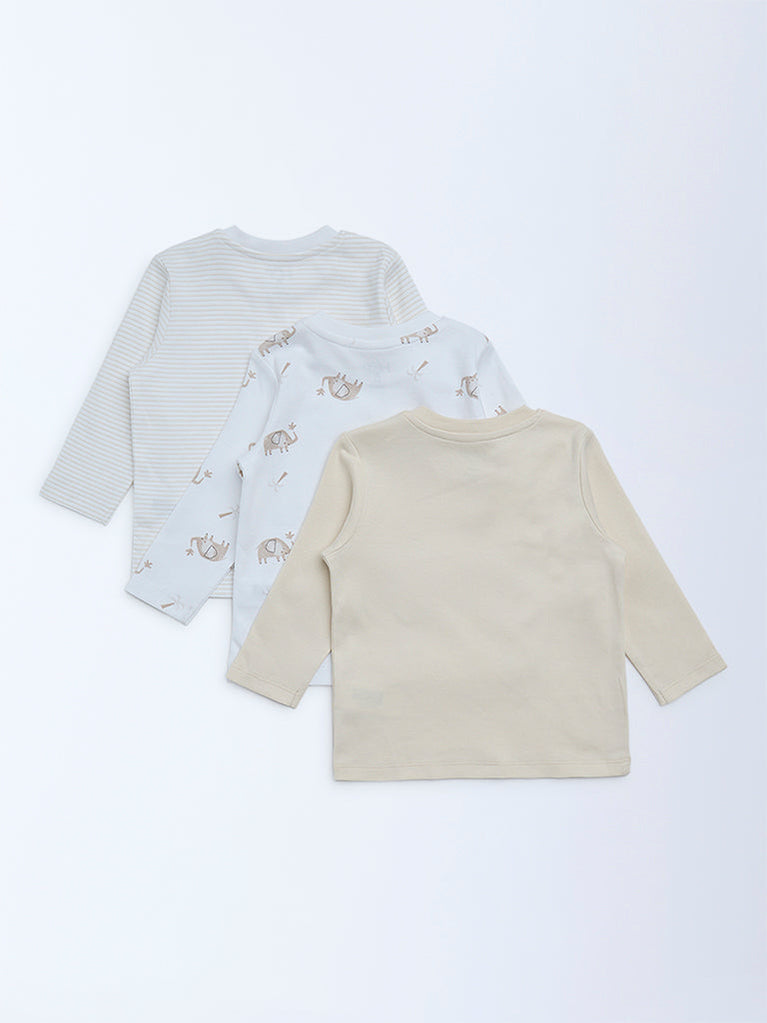 This pack of three t-shirts from HOP Baby is made from soft, breathable cotton to ensure all-day comfort. Featuring a mix of animal prints and stripes in calming beige, cream and off-white shades, these tees are finished with a crew neckline, full sleeves and snap-button shoulder closures for easy changes.