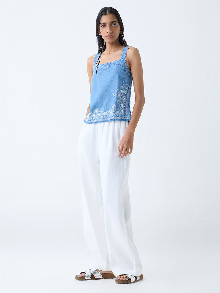 Bombay Paisley brings a crafted sensibility to this indigo top, defined by multi-hued floral embroidery that stands out against the rich base. It features broad adjustable straps, a square neckline and a softly smocked back that keeps the fit easy and breathable. Made from a cotton-blend fabric ideal for rising temperatures, it’s a dependable choice for relaxed outings and unhurried weekend hours.