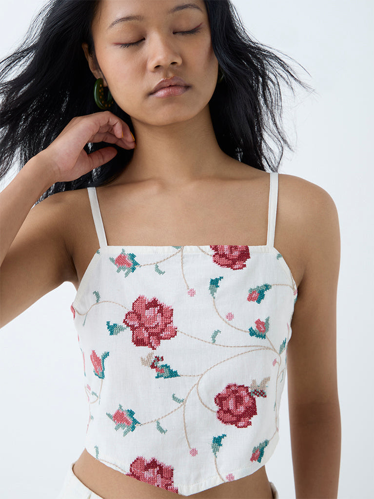 Bombay Paisley Off-White Floral Embroidered Cotton Top