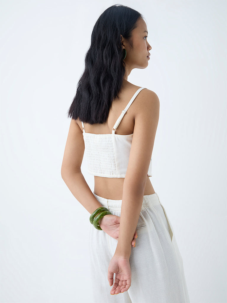 Bombay Paisley introduces this off-white tube top, fashioned with leaf embroidery for a touch of nature-inspired charm. Crafted from a luxurious cotton-linen blend, it features a flattering peplum silhouette and a smocked back that offers gentle structure while keeping the look breezy and feminine.