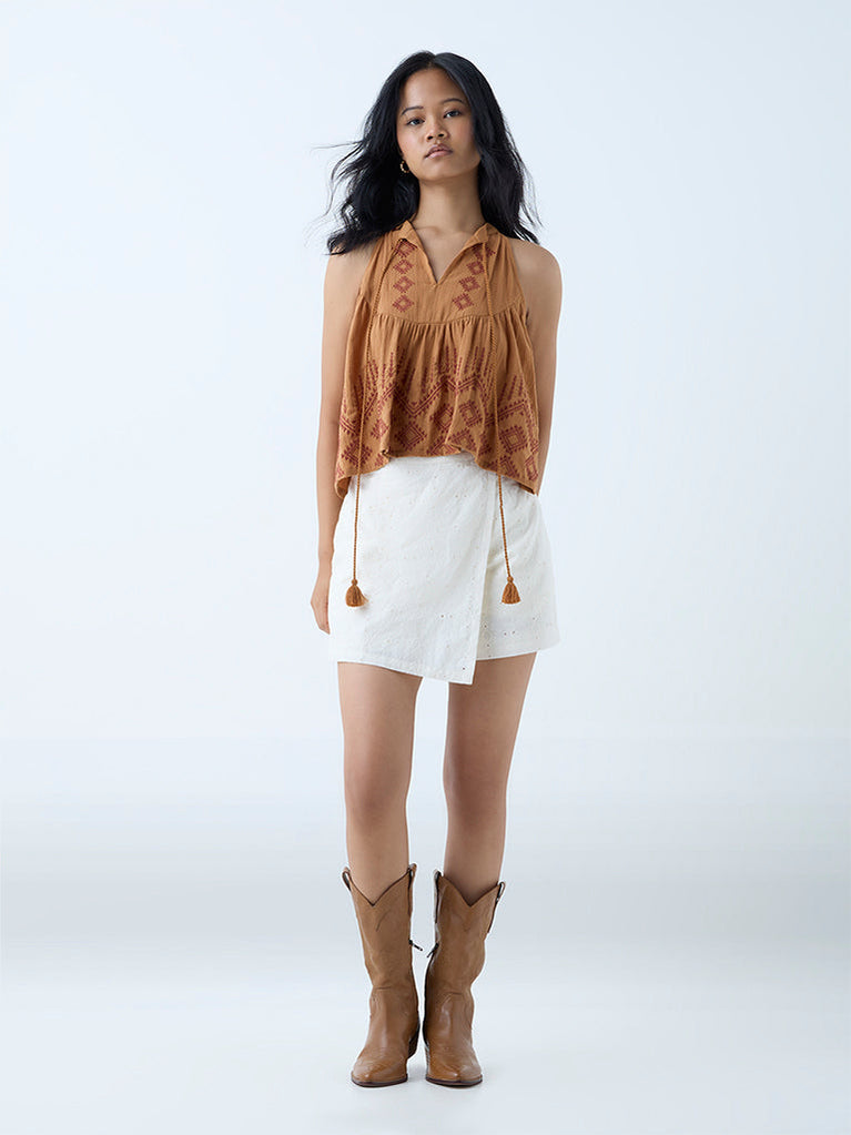Enhance your style quotient with this off-white top from Bombay Paisley. Cross-stitch embroidery on a crinkle-textured layer brings subtle artistry, while a V-neck and sleeveless cut keep it breezy and modern. Constructed from a cotton-rich fabric, it offers superior comfort throughout the day.