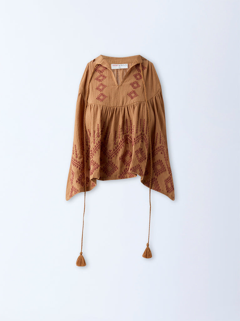 Bring a touch of boho elegance to your wardrobe with this off-white top from Bombay Paisley. The split neck is framed with intricate embroidery and finished with drawstring ties and playful tassels. Spun from a lightweight fabric with blouson sleeves and textured detailing, it’s perfect for easy brunches or carefree afternoons.