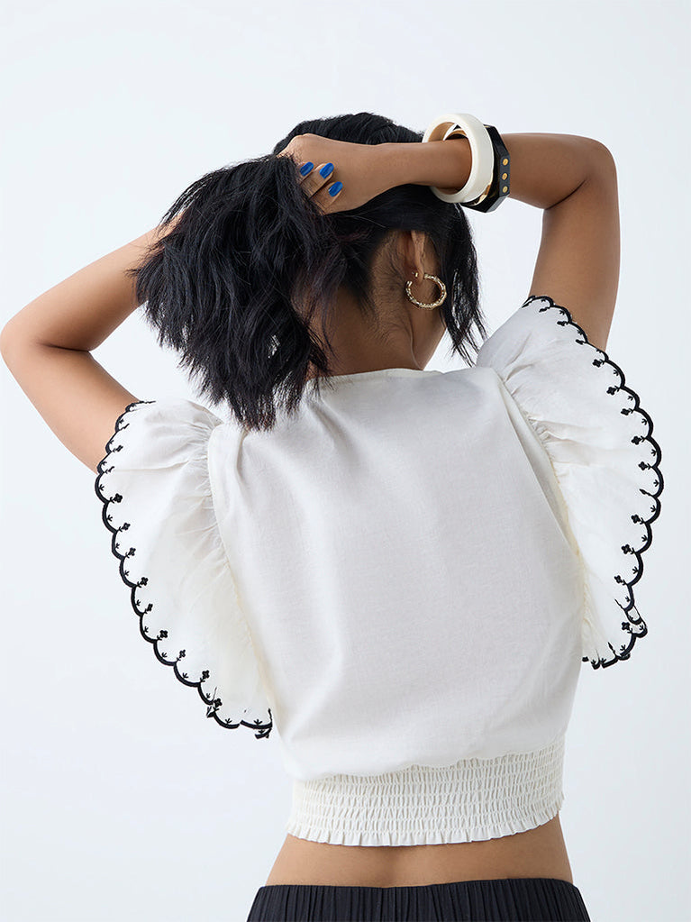 This off-white top from Bombay Paisley captures a breezy charm with its intricate floral embroidery and vintage-inspired angel sleeves. Crafted from pure cotton for all-day comfort, the design is framed by a flattering V-neck and finished with a smocked waist that cinches the silhouette.