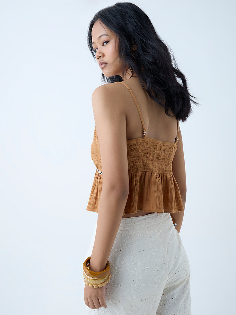 Add a touch of boho charm to your wardrobe with this mustard peplum top from Bombay Paisley. Milled from pure cotton, it’s adorned with floral embroidery that adds a handcrafted appeal. The V-neck is framed by adjustable shoulder straps, while the smocked back ensures a fitted look.