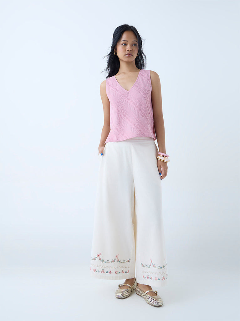 This pink top from Bombay Paisley is elevated with delicate floral embroidery that lends a feminine touch. Created from pure cotton for daily comfort, it includes a flattering V-neckline and sleeveless cut for a breezy finish.