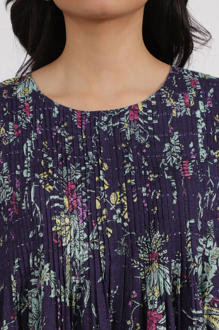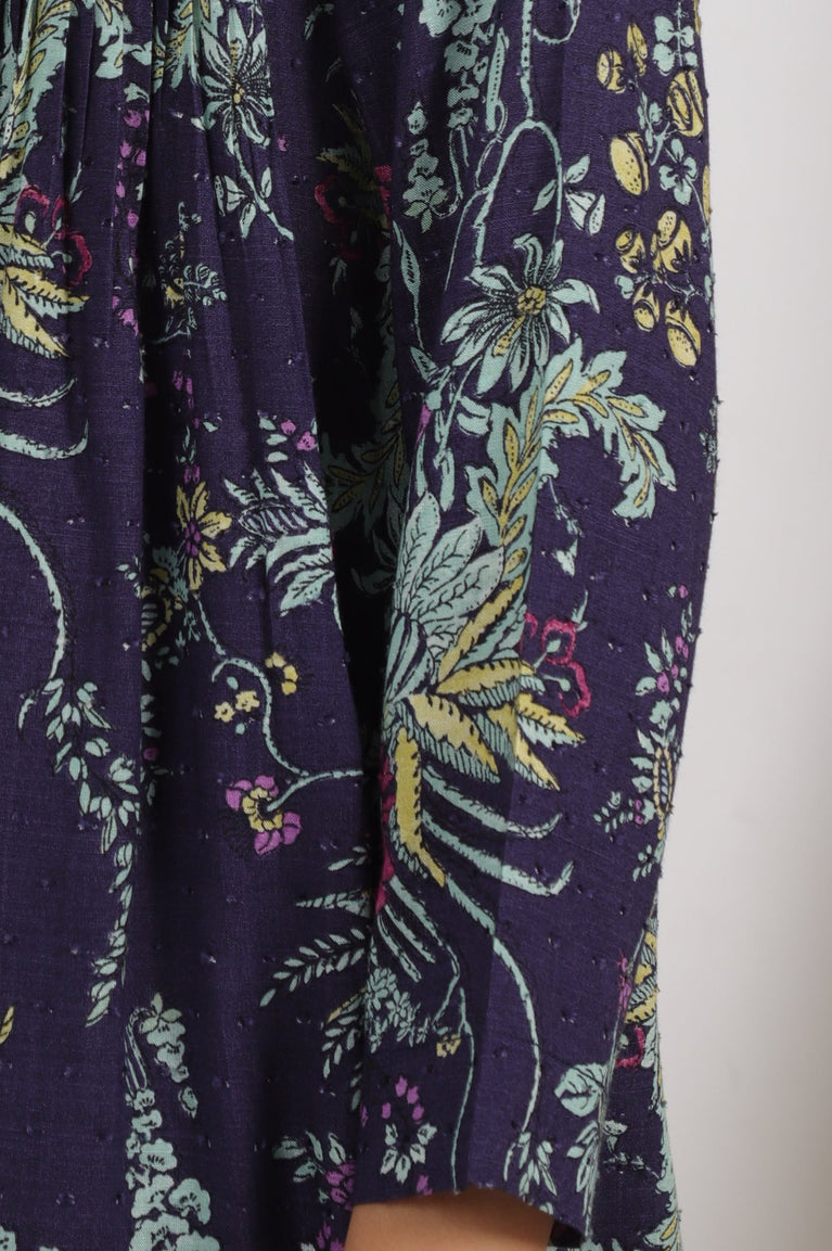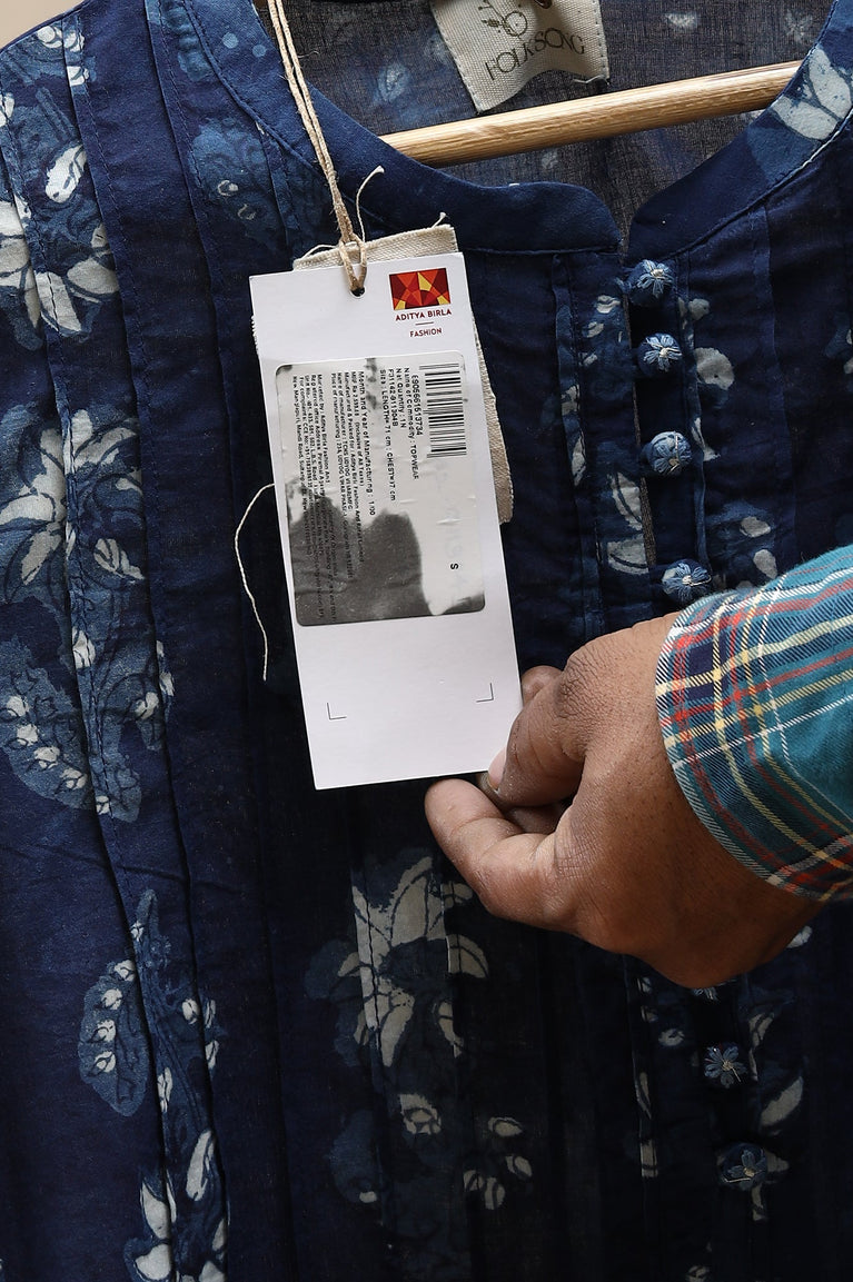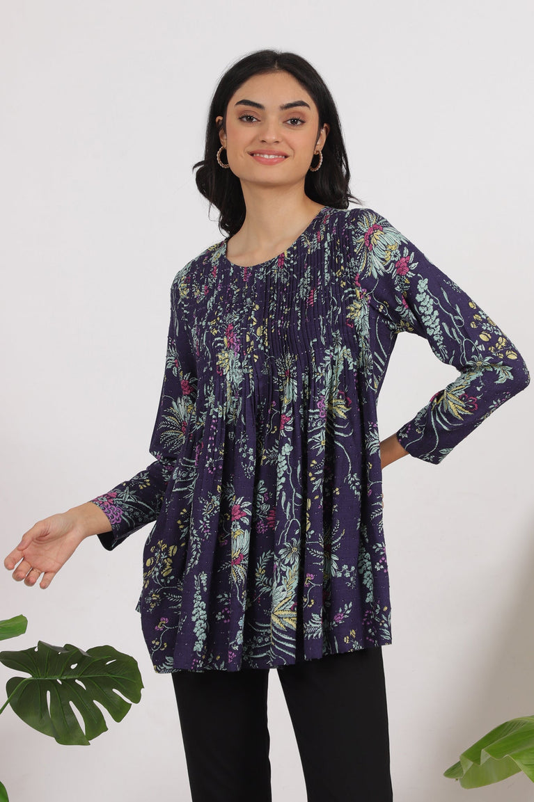 An indigo statement block printed top with mandarin collar and pintuck detail in body. The sleeves have pleats detail, further highlighted with dot print facing detail.