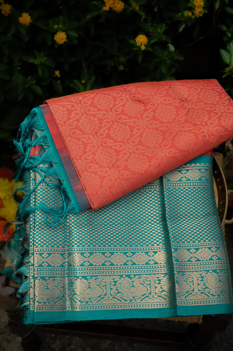 Varamahalakshmi Peach Orange & Teal Green Kuppadam Jaal Saree