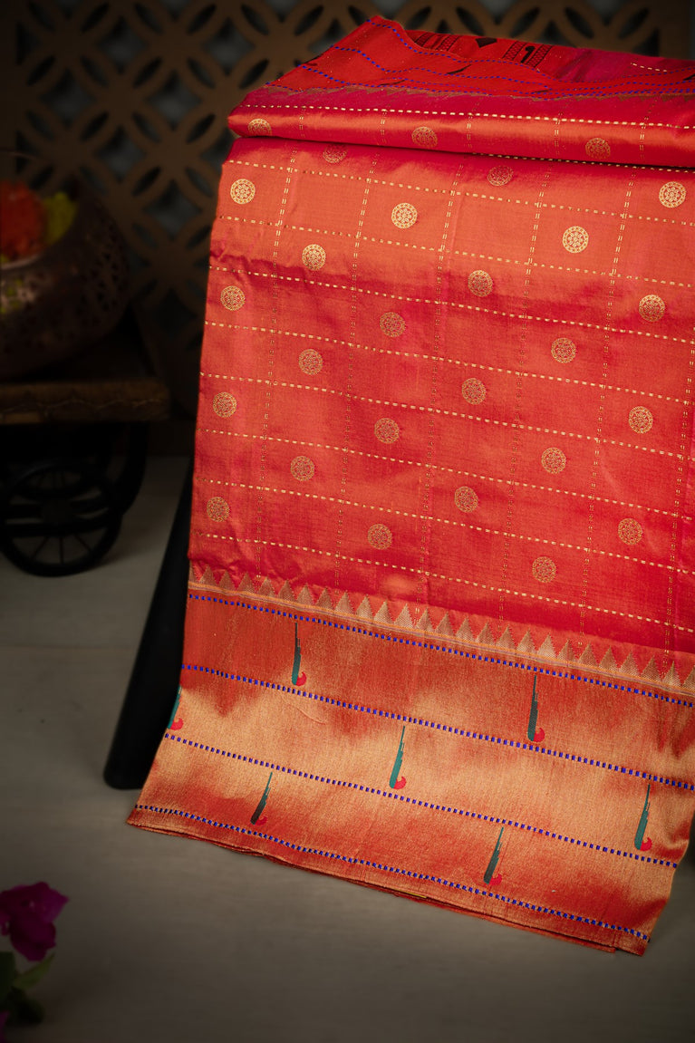 Varamahalakshmi Peach Pink & Gold and Red Paithani Buttis Saree
