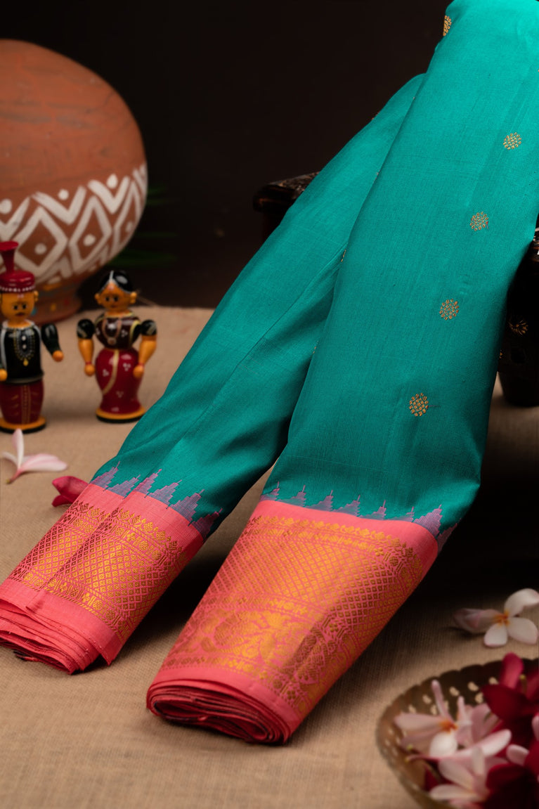Varamahalakshmi Peacock Green & Peach Gadwal Buttis Saree