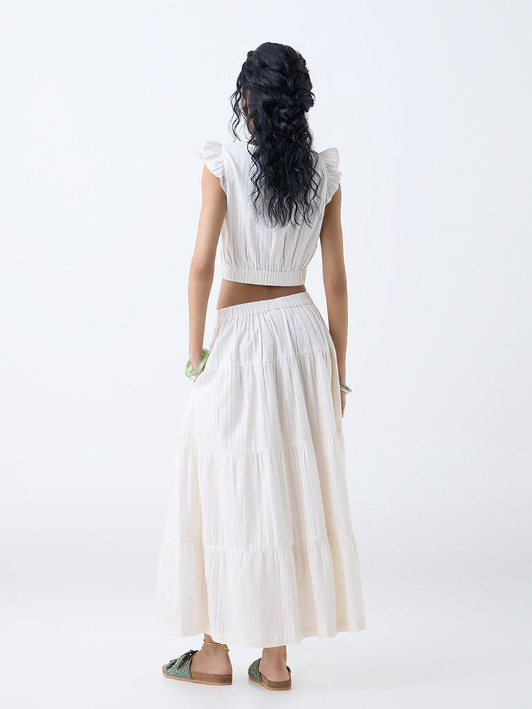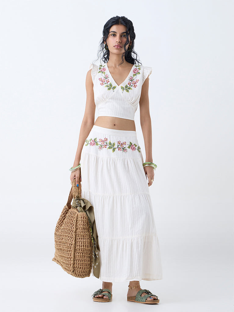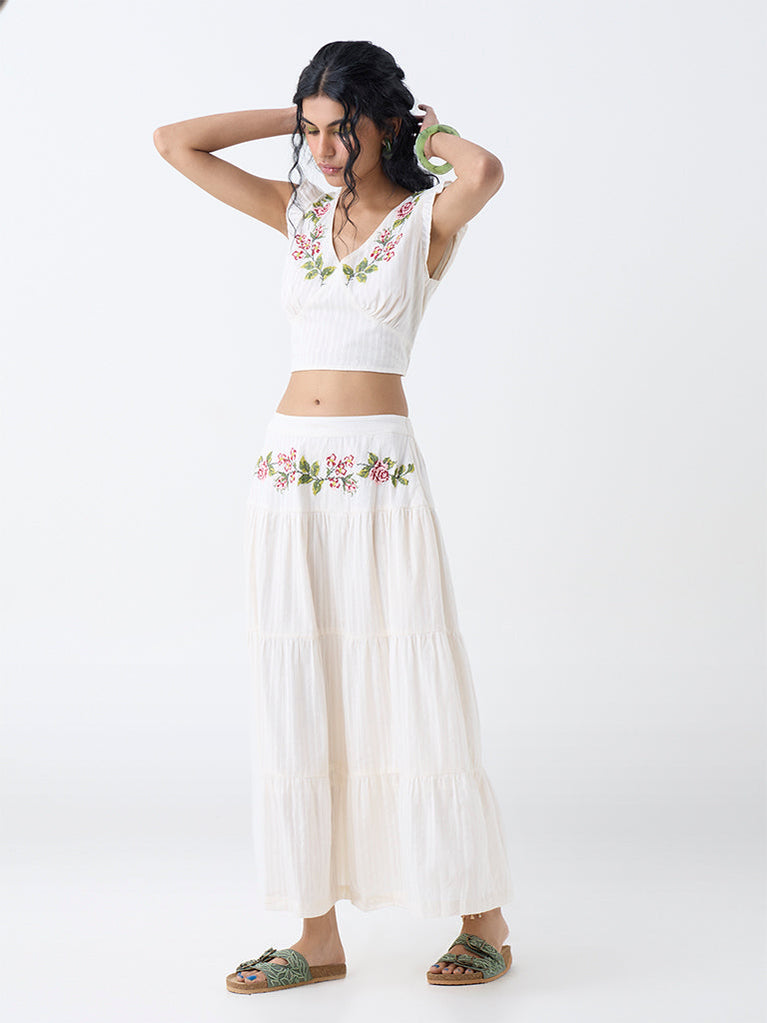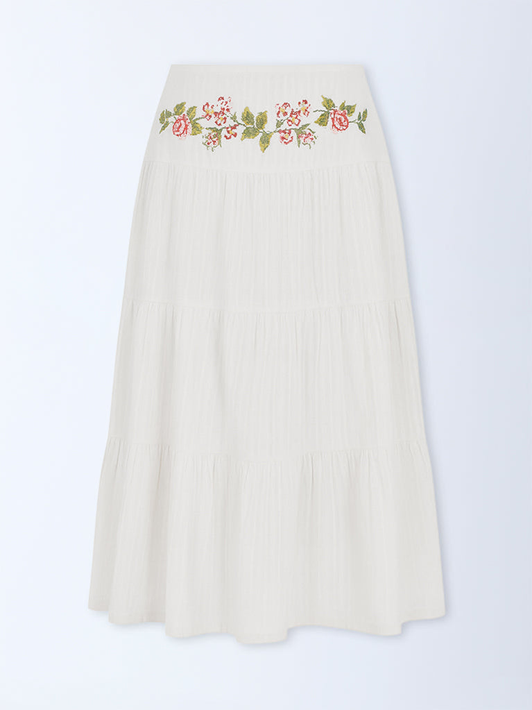 Bombay Paisley Off-White Embroidered Tiered Cotton Skirt