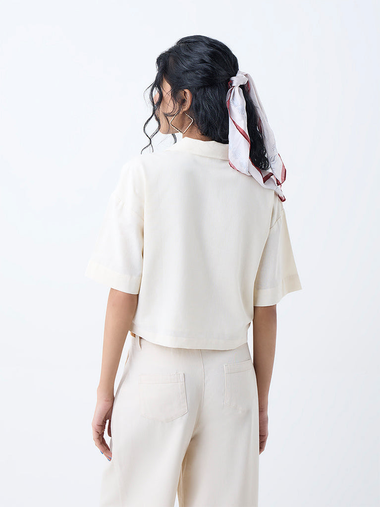 This off-white shirt from Bombay Paisley is embroidered with floral motifs on a soft crinkle-textured layer. The spread collar and bell sleeves add a hint of retro polish, while the button-up front keeps it contemporary. Cut from cotton-rich fabric with a gentle drape, it’s that perfect piece for warm days that call for light textures and thoughtful detail.