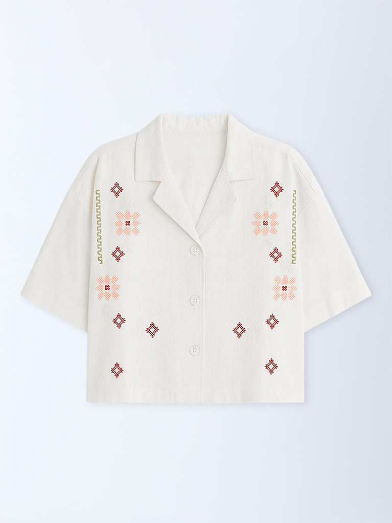 Crafted with a keen eye for detail, this off-white shirt from Bombay Paisley showcases cross-stitch floral embroidery that brings a handcrafted, heritage-inspired nuance to the silhouette. Cut from pure cotton for a soft, breathable feel, it features a mandarin neckline flowing into a button placket and relaxed short sleeves.