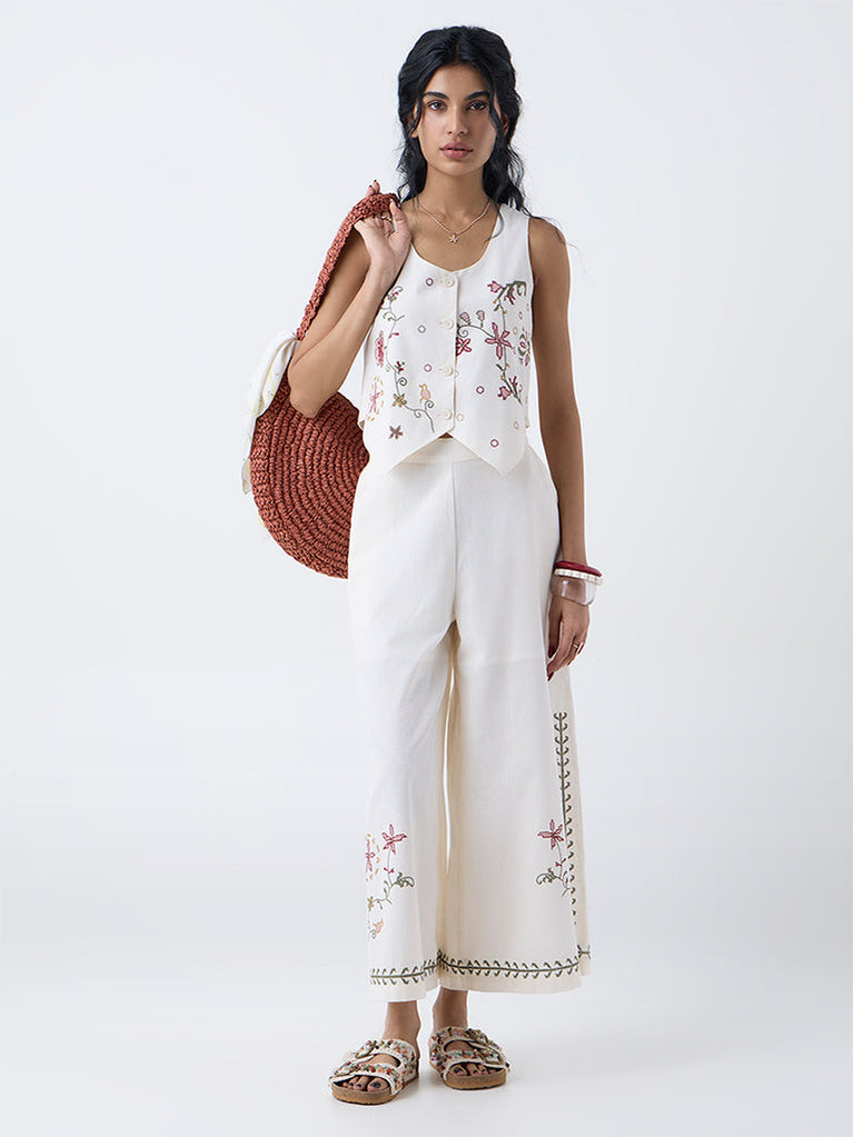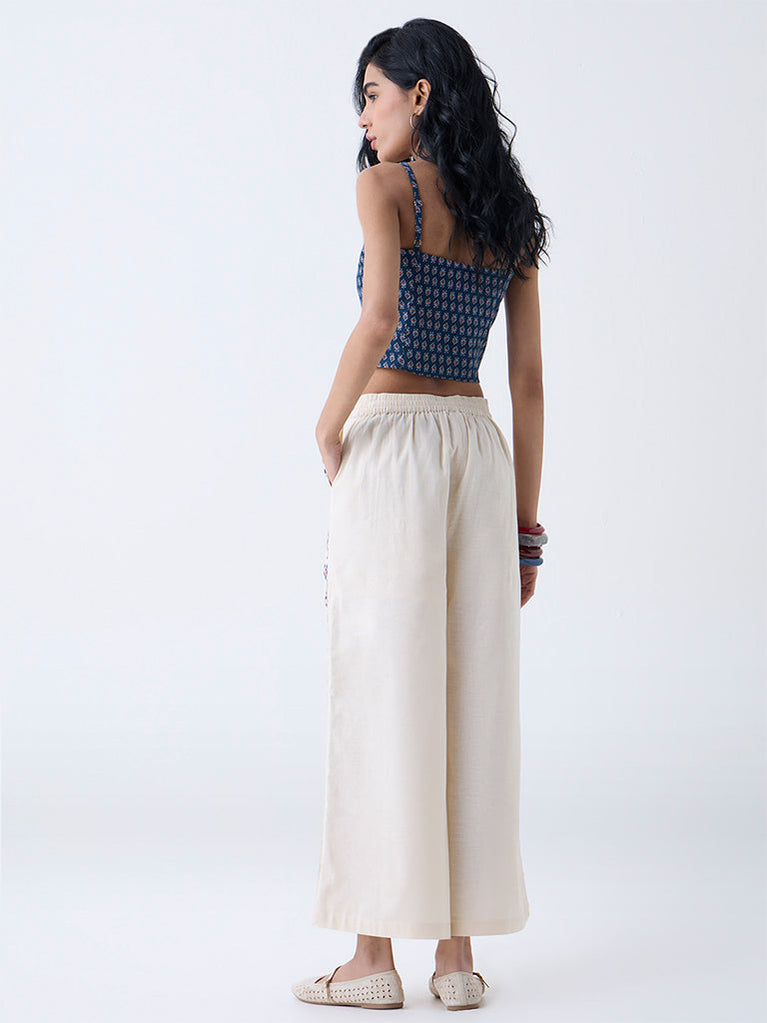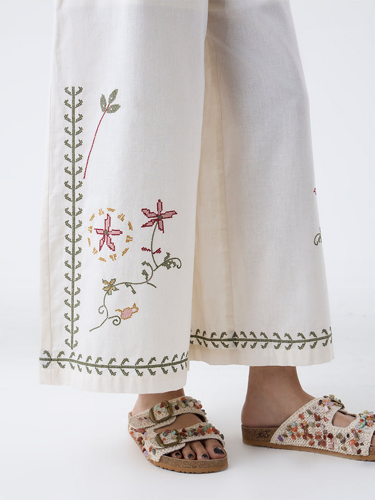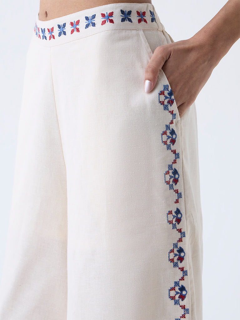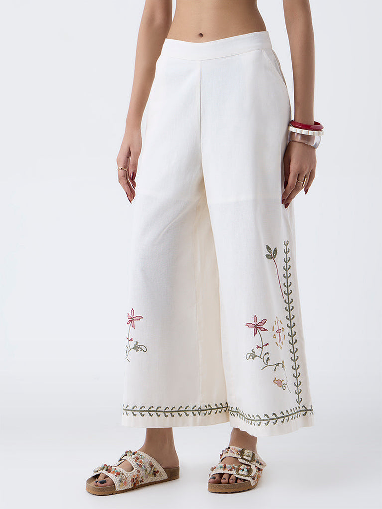 Move through your day with ease and style in these off-white palazzos from Bombay Paisley. Milled from a cotton-rich fabric for daily comfort, they come fitted with an elasticated waistband and side pockets. The delicate floral embroidery throughout accentuates its appeal.