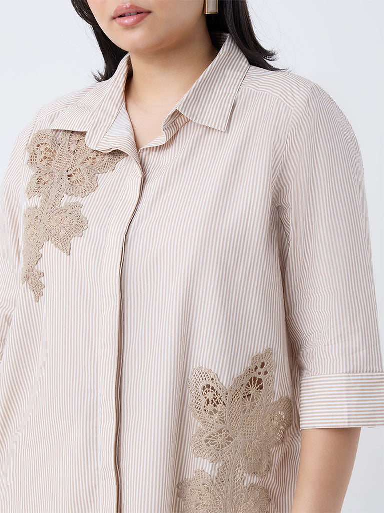 Gia presents this pure cotton beige shirt, designed with intricate floral crochet work that exudes understated elegance. The striped pattern, notched collar, and concealed button-down front lend it a tailored touch, while the three-quarter sleeves complete its effortlessly refined look.