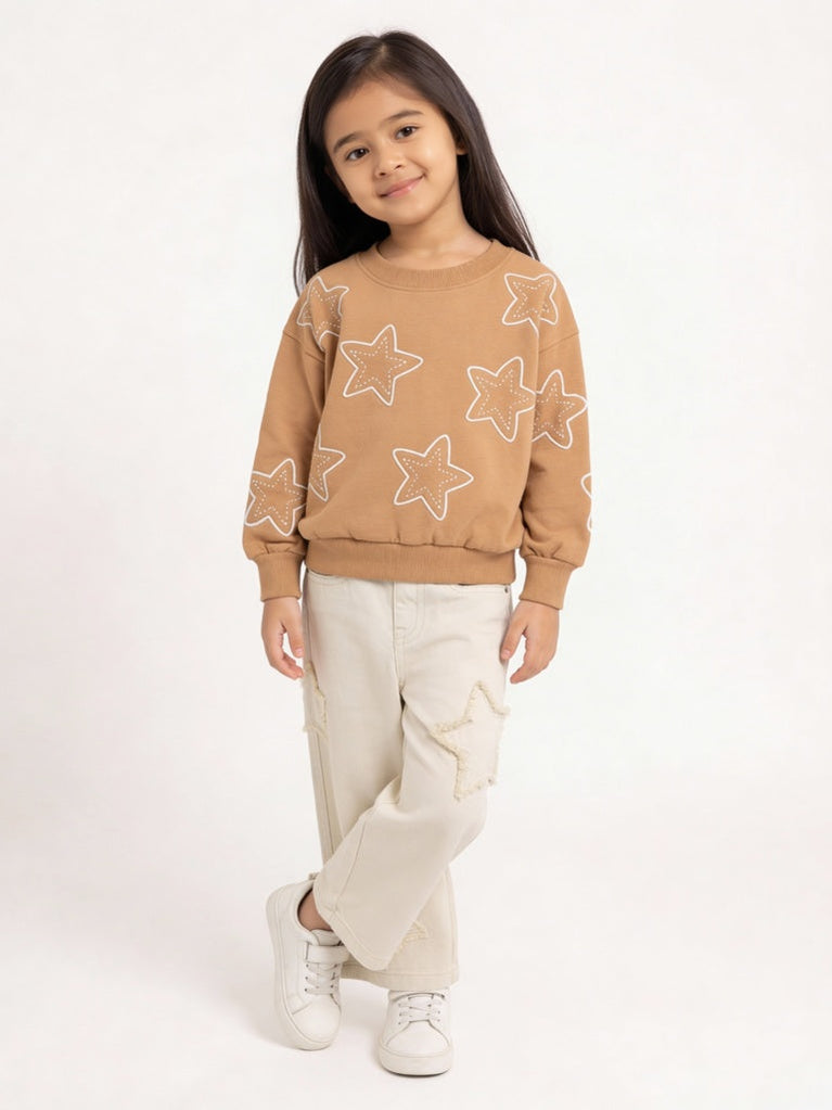 HOP Kids Girls Light Brown Star Design Cotton-Blend Sweatshirt