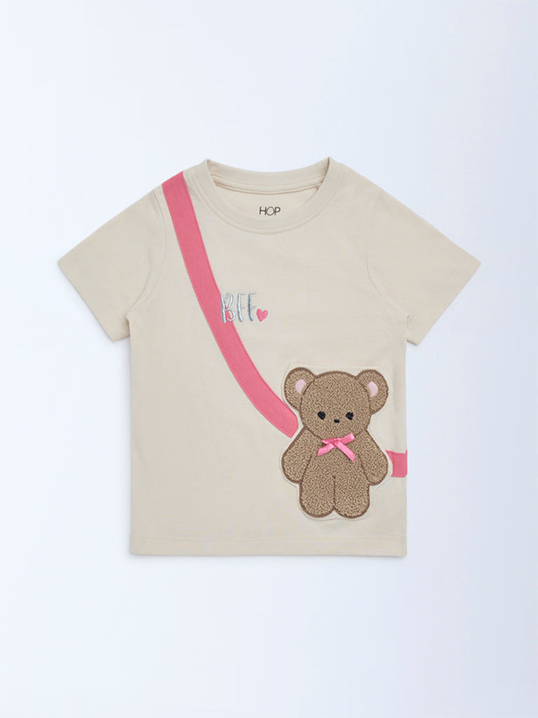 HOP Kids Girls Beige Embroidered Cotton T-Shirt