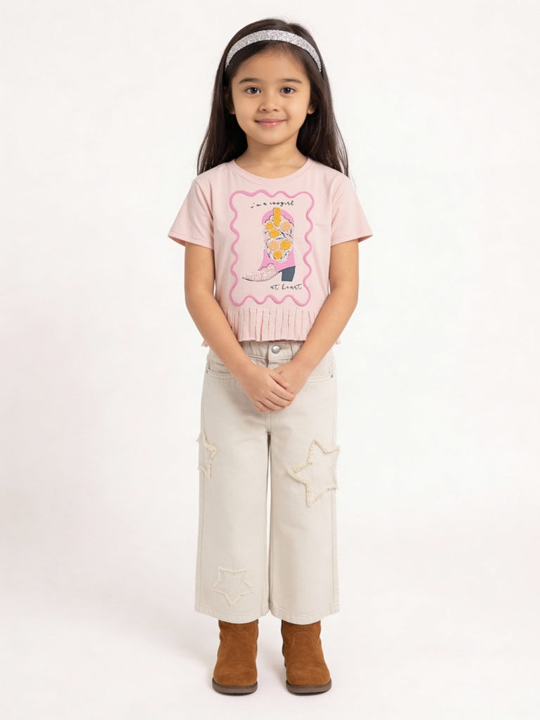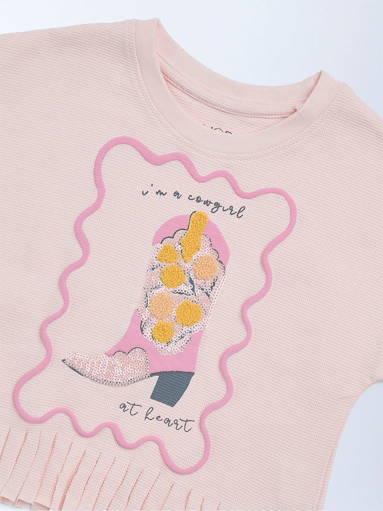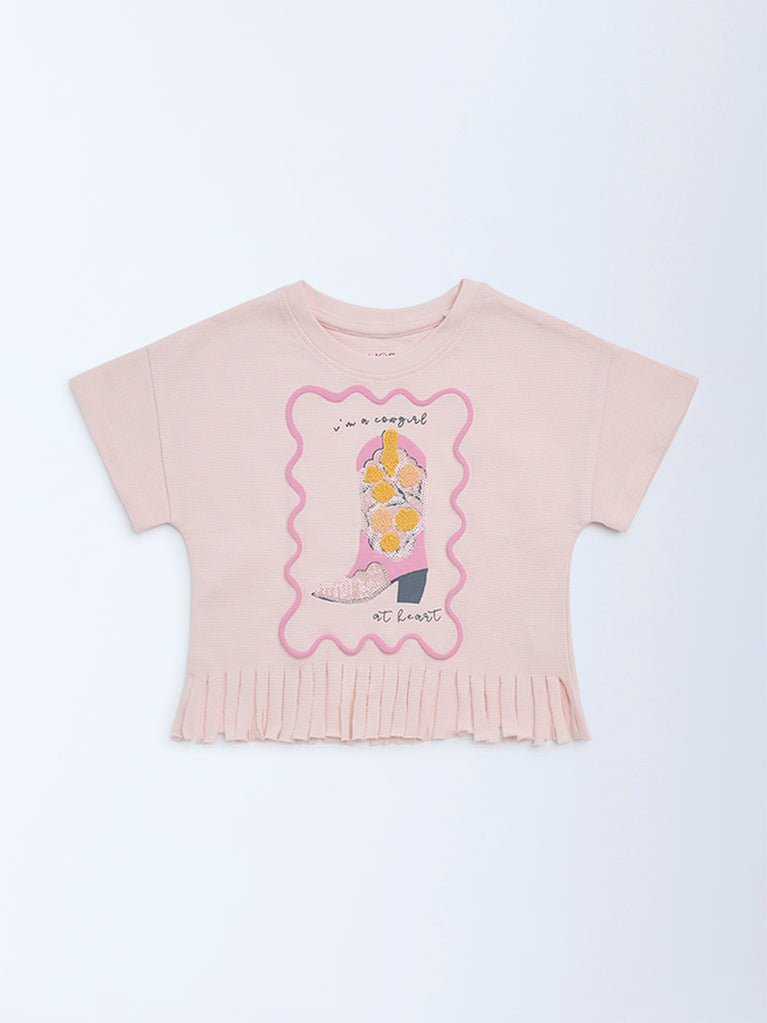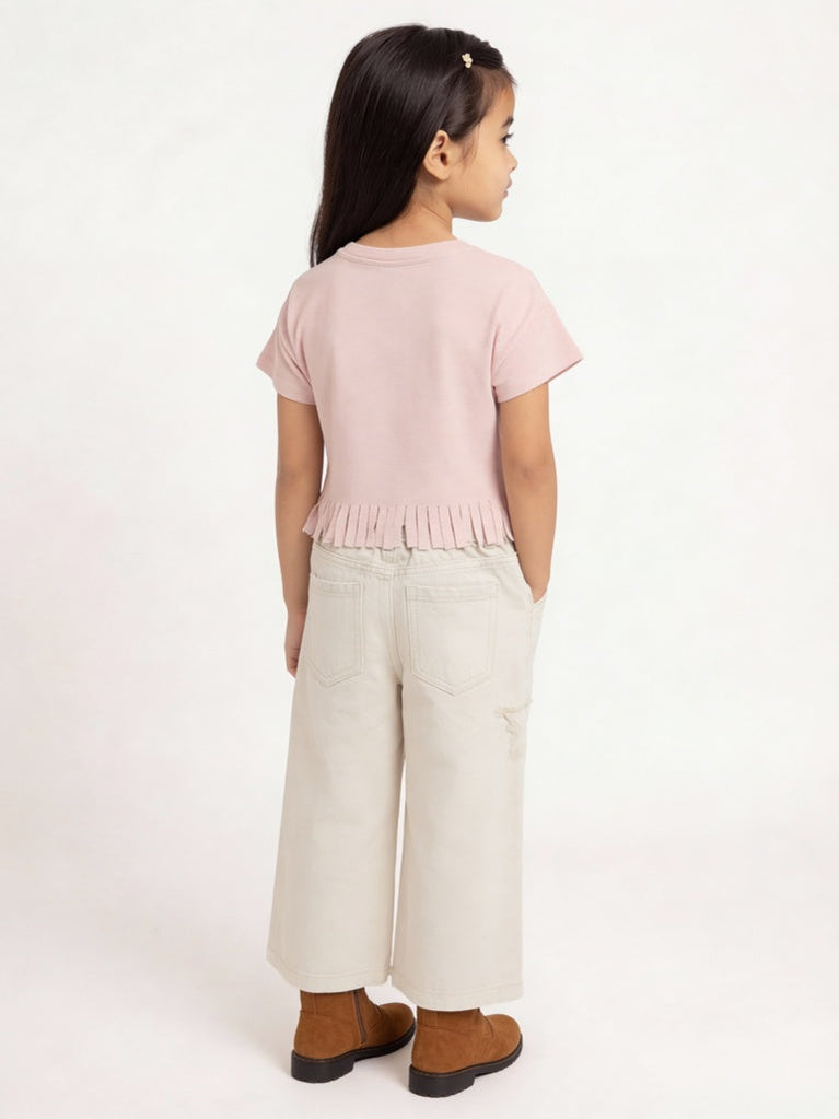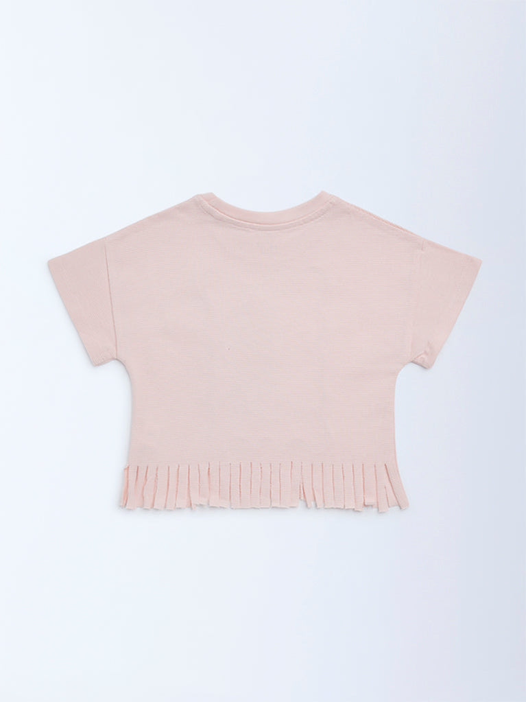 Let her everyday outfits feel a little more fun with this pink top by HOP Kids. Designed with a cheerful front graphic and soft textured detailing, it adds a playful pop to casual looks. Spun from pure cotton, it keeps her at ease through playtime and outings. The short sleeves and easy crew neckline make it simple to wear, while the fringed hem adds a cute finishing touch.