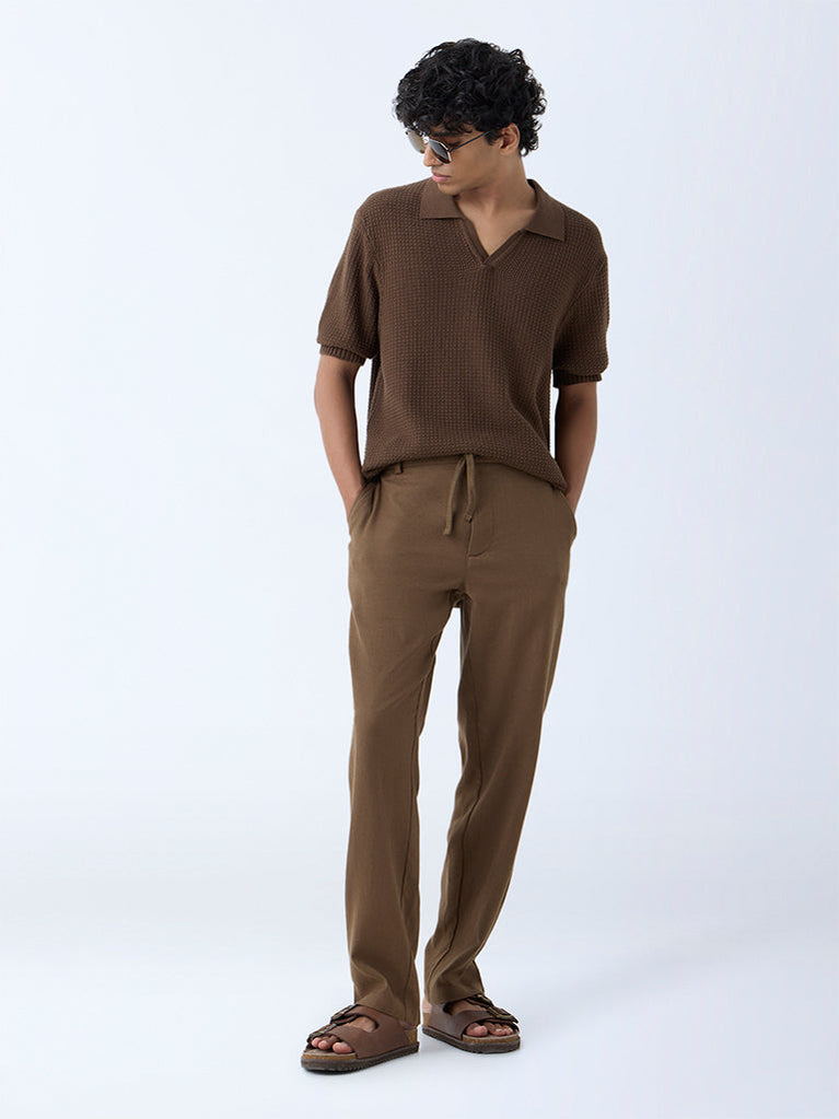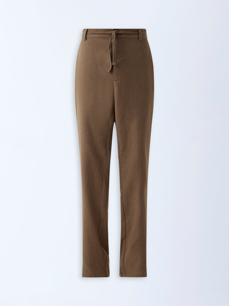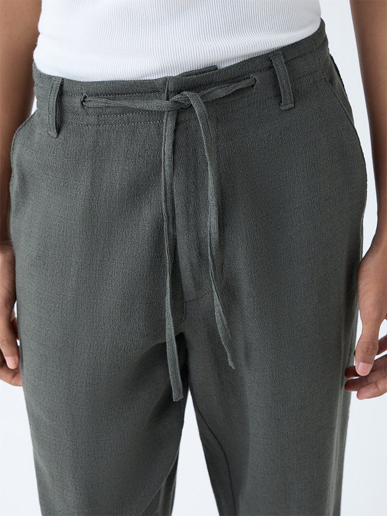 These olive pinstriped cotton pants from ETA combine laid-back comfort with subtle sophistication. Designed in a relaxed mid-rise silhouette, they feature a smooth elastic waistband with adjustable drawstrings and multiple pockets—perfect for effortless, everyday wear.