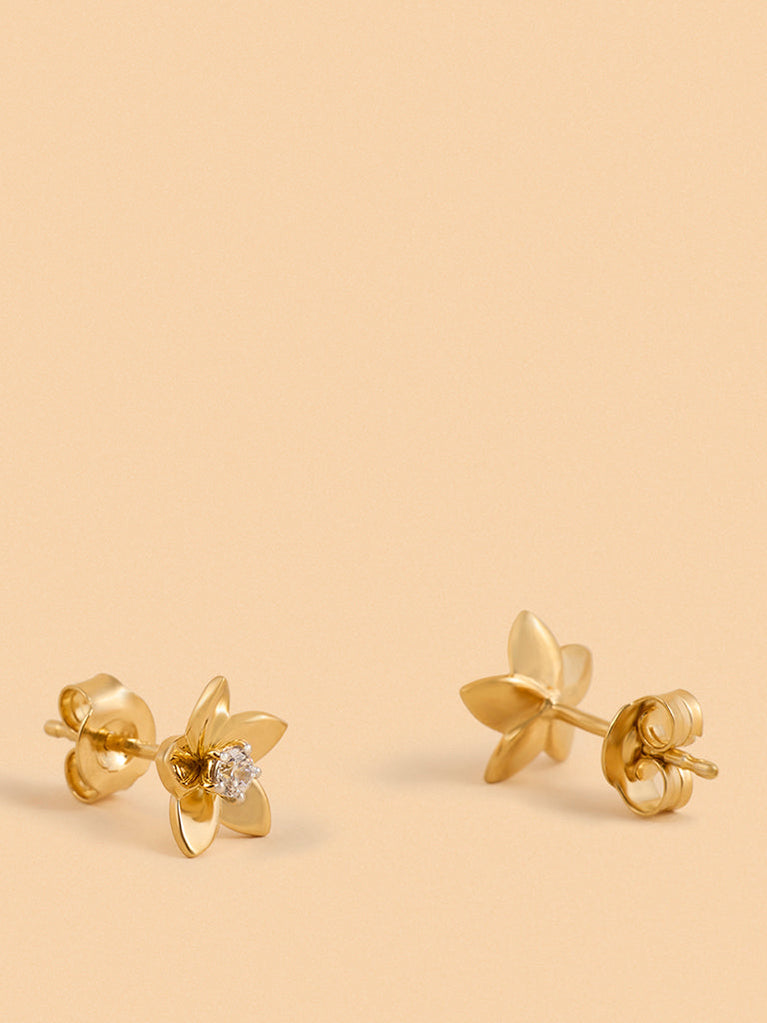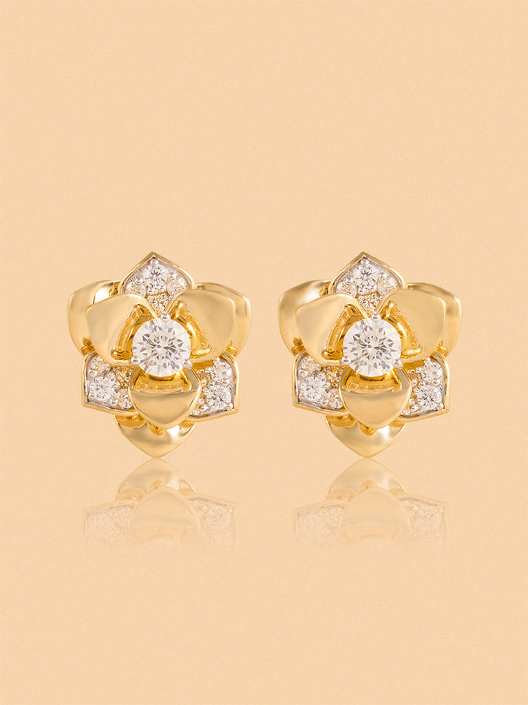 These gold-tone floral solitaire earrings from Westside X Pome are crafted with a polished finish. Each earring showcases a delicate floral motif centered around a single clear stone, designed in a petal-inspired silhouette. The post-back closure ensures a secure and comfortable fit, making this a timeless accessory.