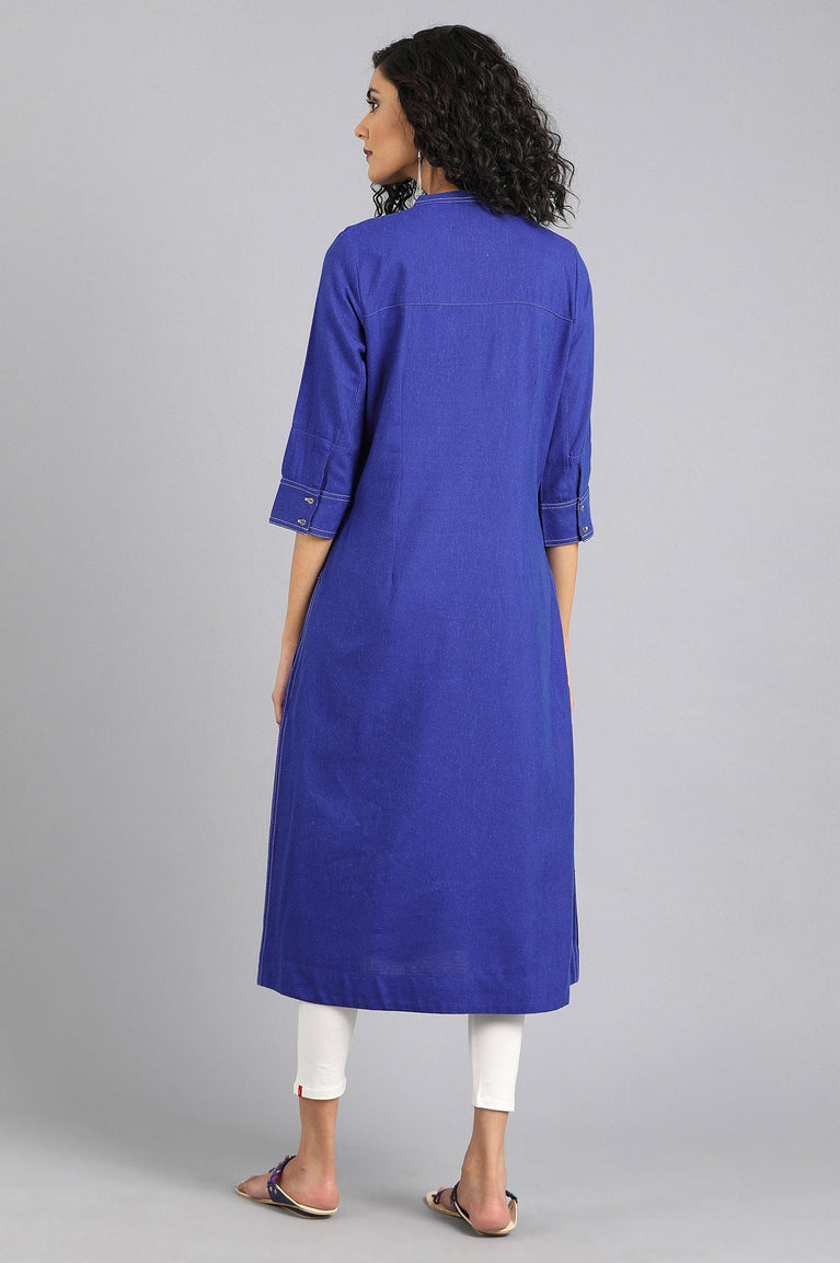 Blue mandarin neck yarn-dyed kurta with placket detail.