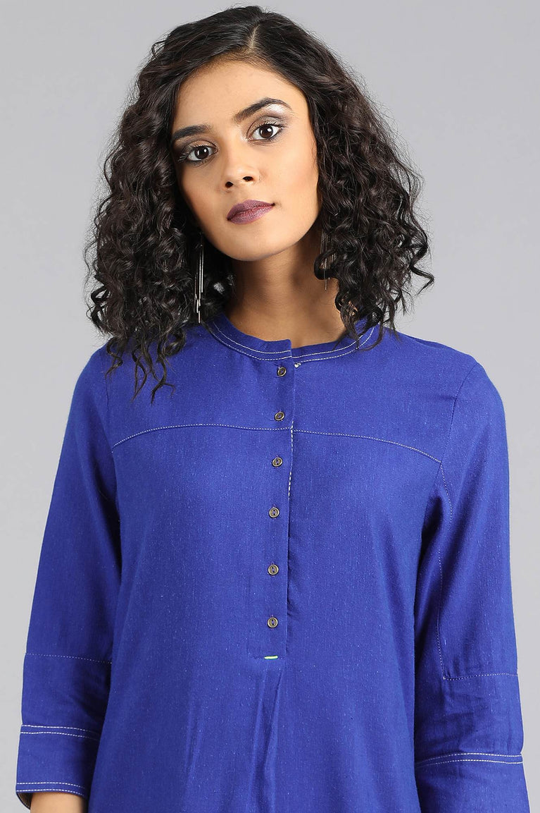 Blue mandarin neck solid kurta with button placket detail on the front and side slits.