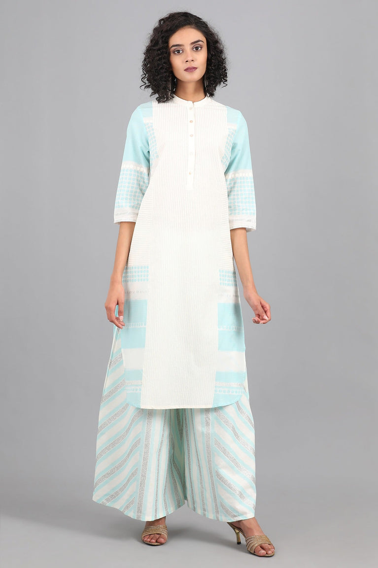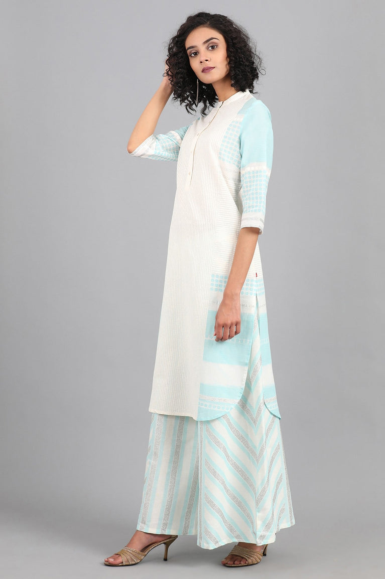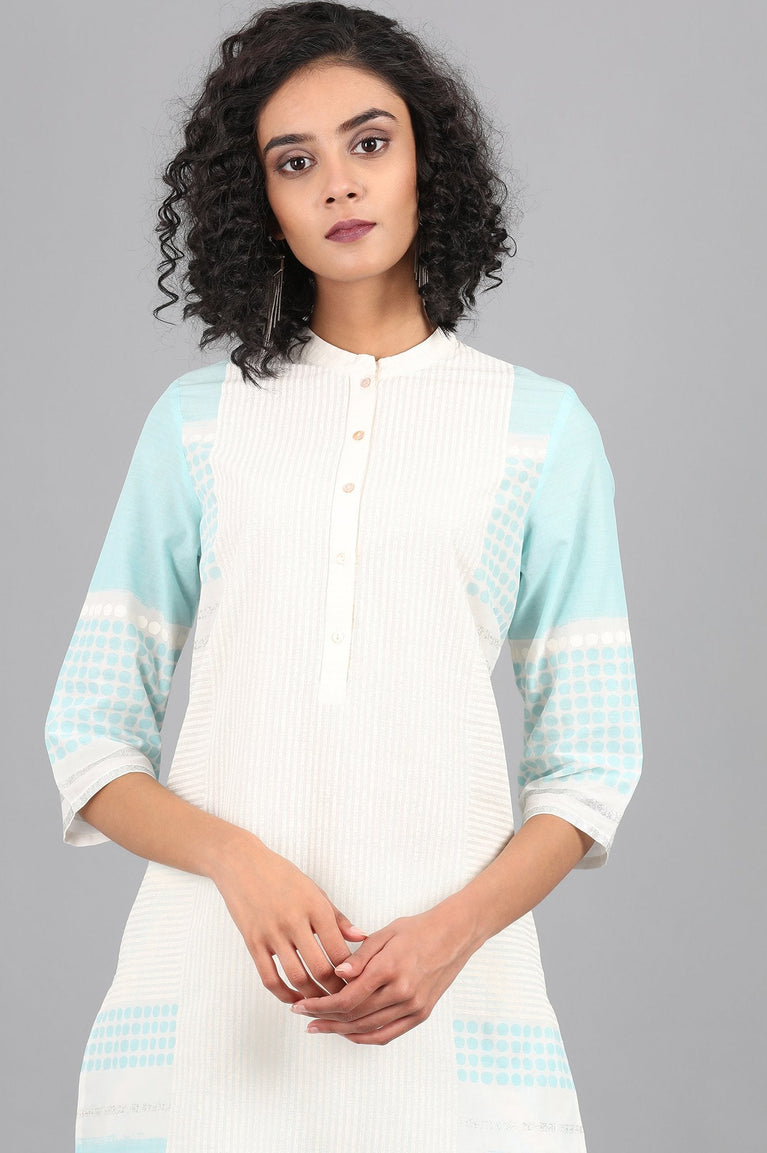 Blue mandarin neck 3/4 sleeve kurta with printed detail.