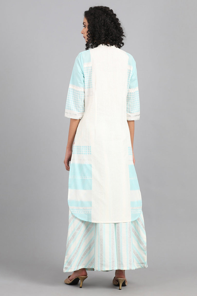Blue mandarin neck yarn-dyed kurta with v-slit neckline.