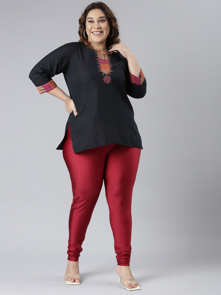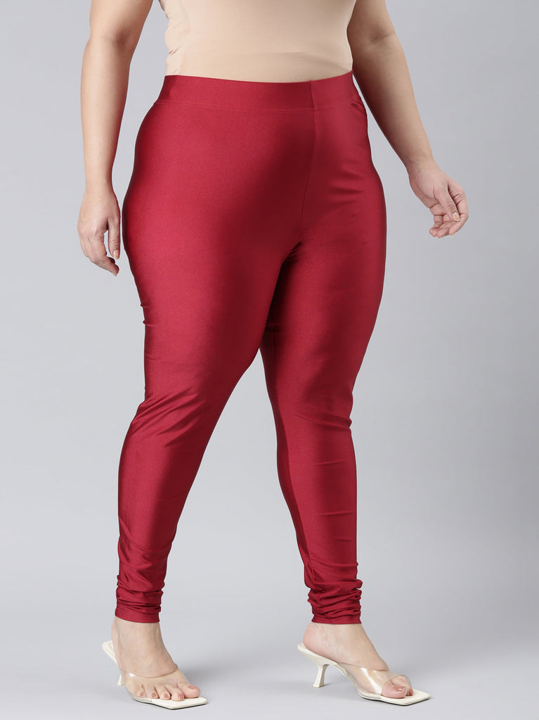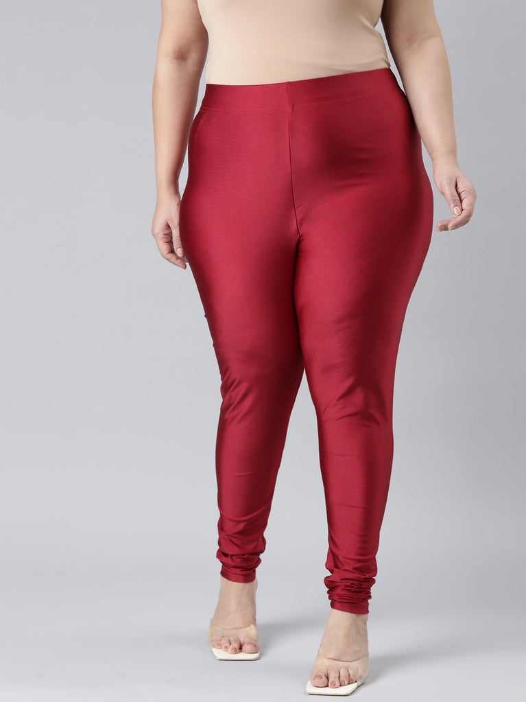 Go chic with a pair of Dark Red Solid Shimmer Churidar Leggings. Made from high quality Nylon & Elastane, it has a elasticised waistband & gathers at the hemline.