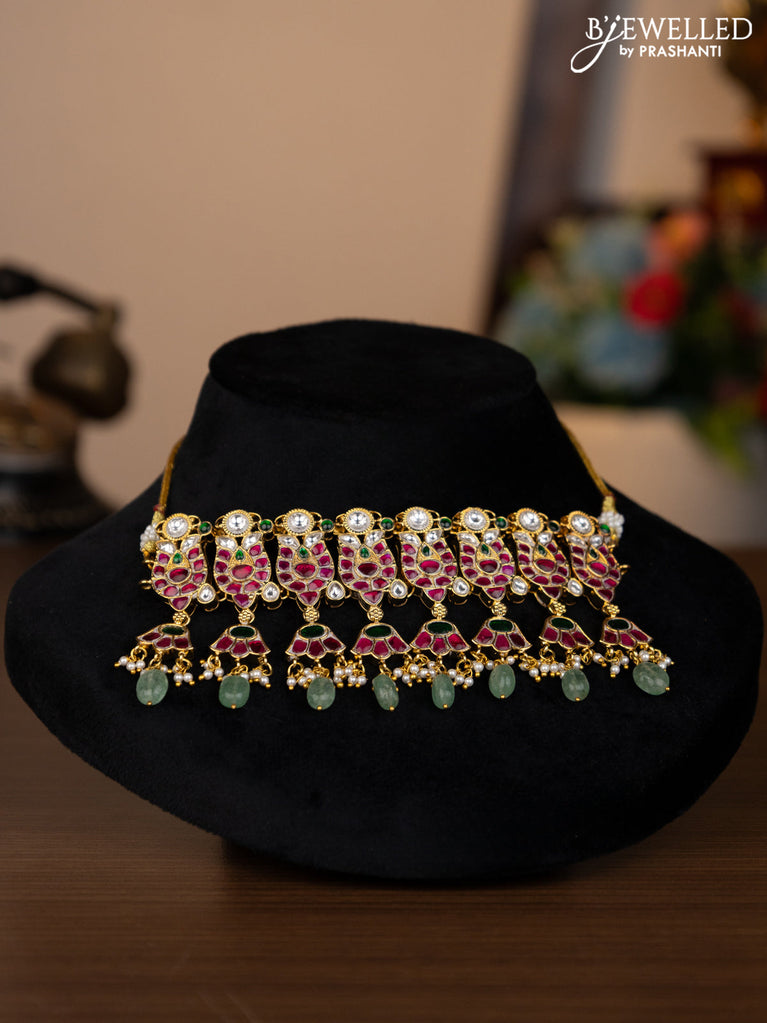 Antique choker lakshmi design with pink jadau & cz stones and golden beads hanging